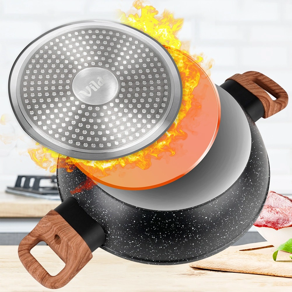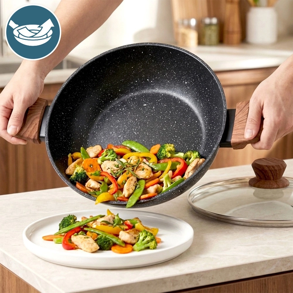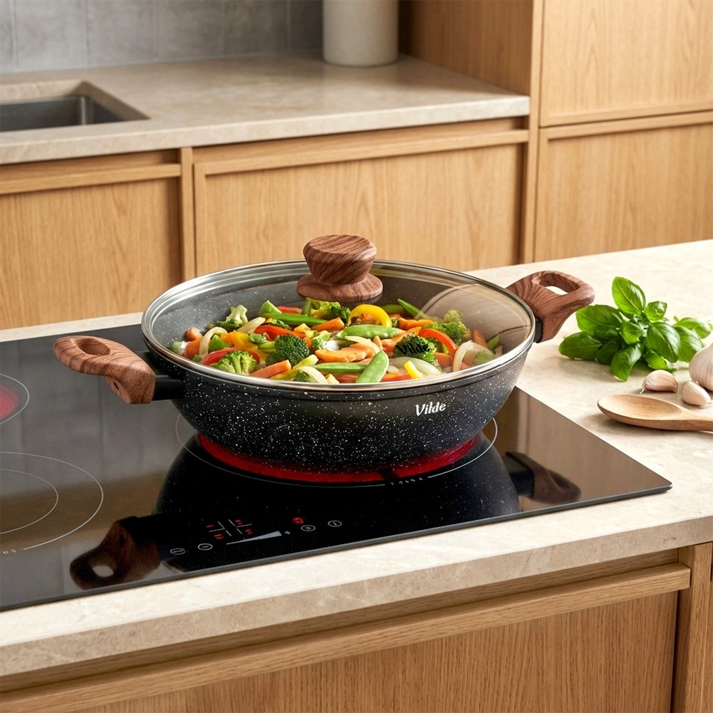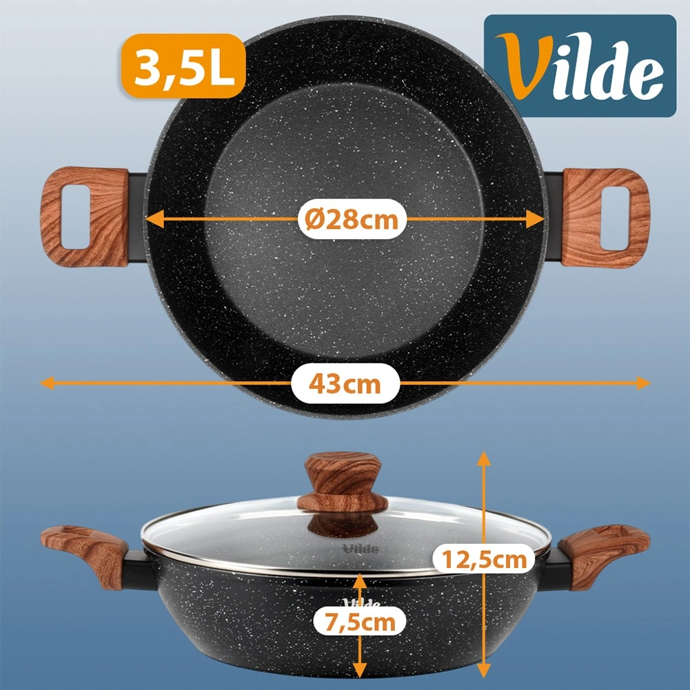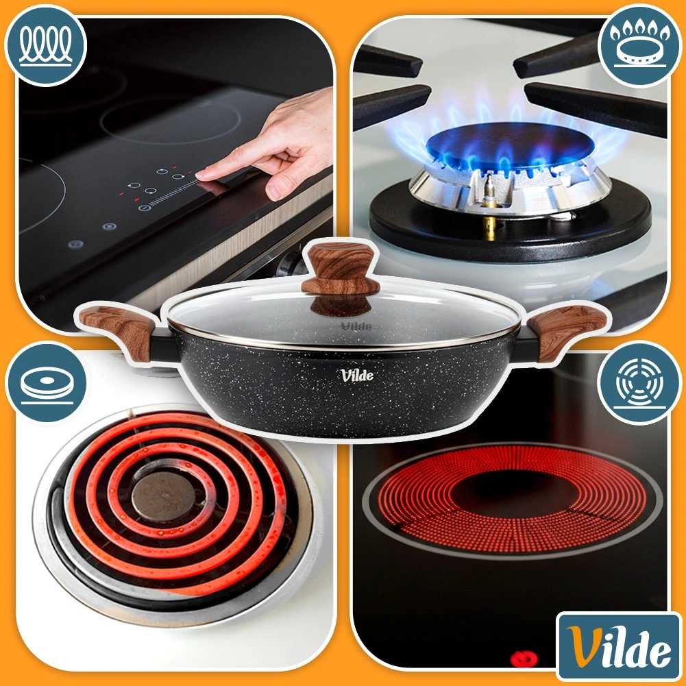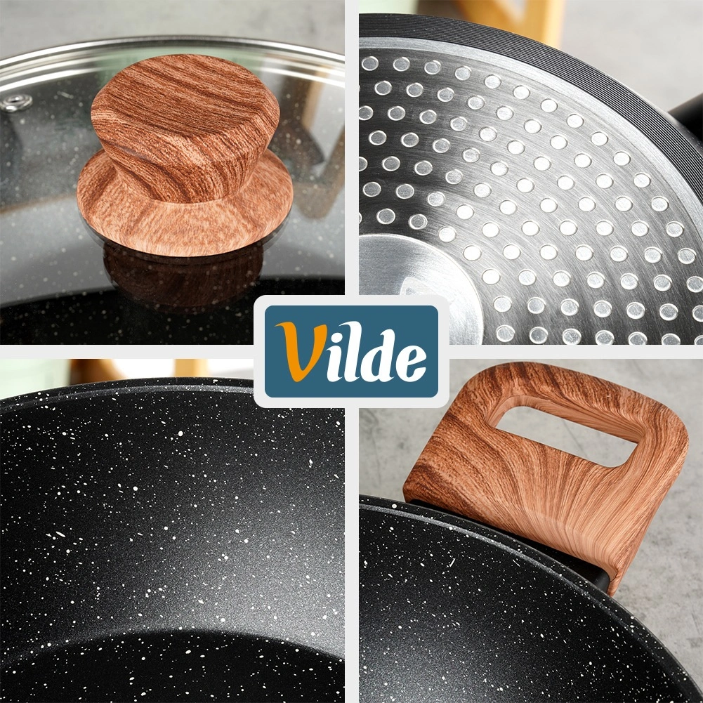 The Vilde deep pan from the Granitica Wood line is a versatile helper for frying, braising, and baking. The durable cast aluminum body with a non-stick granite layer ensures even heat distribution and easy release without sticking. The transparent glass lid with a steam vent lets you control cooking without lifting the lid.