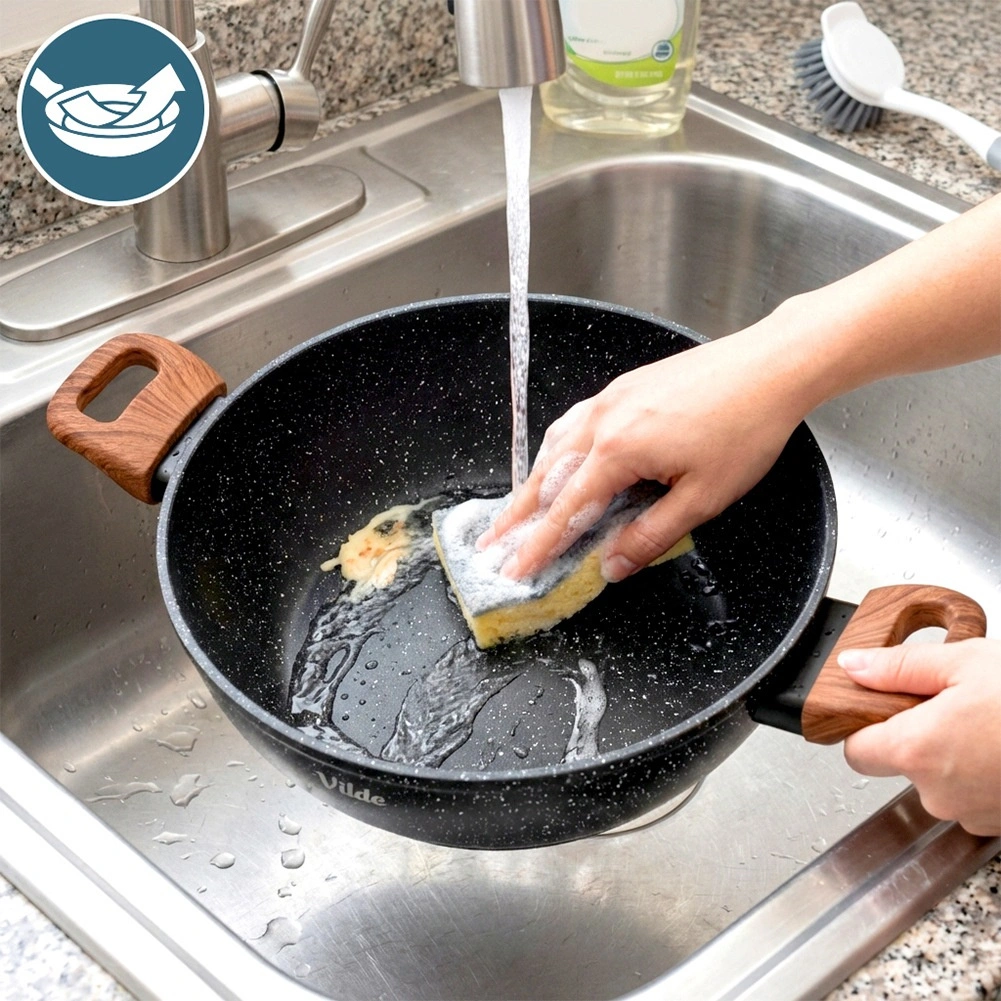 Thanks to the two wide soft-touch handles with a wood-look finish, you have a secure and comfortable grip when transferring and serving straight to the table. The pan is suitable for induction, gas, electric, and ceramic hobs and is dishwasher safe.