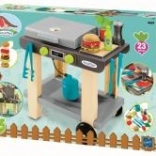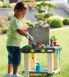 Enjoy realistic pretend cooking with this kids' gas grill featuring a wheeled side table and a lid. It comes with plenty of accessories, including play food, a gas bottle, a salt grinder, olive oil, a potted basil plant, and tableware. Mobile design, easy to use, and lots of add-ons for creative play at home or in the garden.