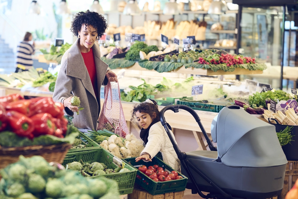 The stroller is from birth compatible with a carrycot (the same for Rockey S/M/L) and with an infant car seat using adapters. Premium textiles made from recycled materials, a 5-point harness, a removable and rotating bumper bar, an adjustable leg rest, and a large extendable canopy with side ventilation ensure comfort and safety. All four wheels feature suspension, with an advanced brake and an integrated safety indicator for a calm and confident ride.