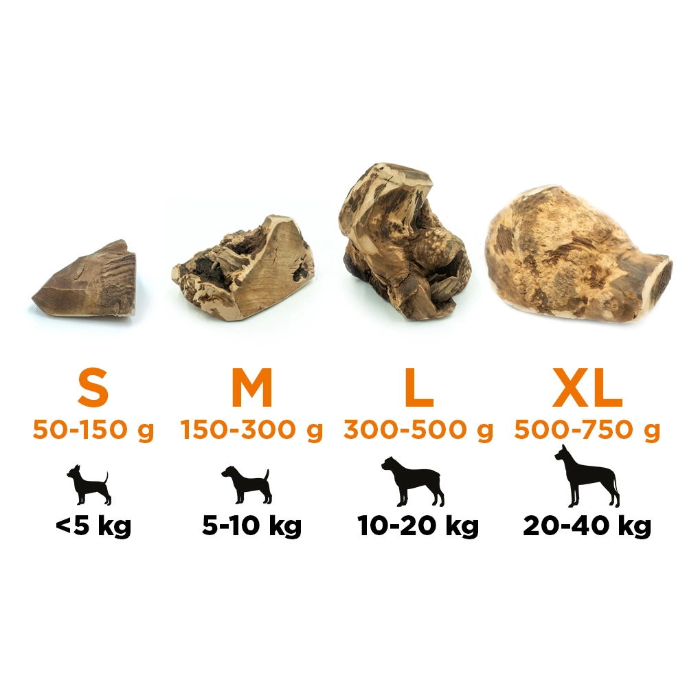 Unlike ordinary wood, the root does not splinter into sharp pieces. Chewing helps mechanically remove plaque from teeth and contributes to maintaining dental hygiene. Thanks to its high hardness, it withstands intensive use and keeps your dog entertained for a long time.