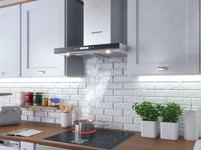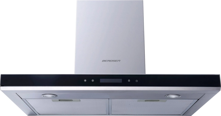 The elegant BERDSEN chimney cooker hood for modern kitchens combines INOX stainless steel and glass, offering a high airflow of 335 m3/h, quiet operation, energy-saving LED lighting, and convenient touch controls with 3 power levels.