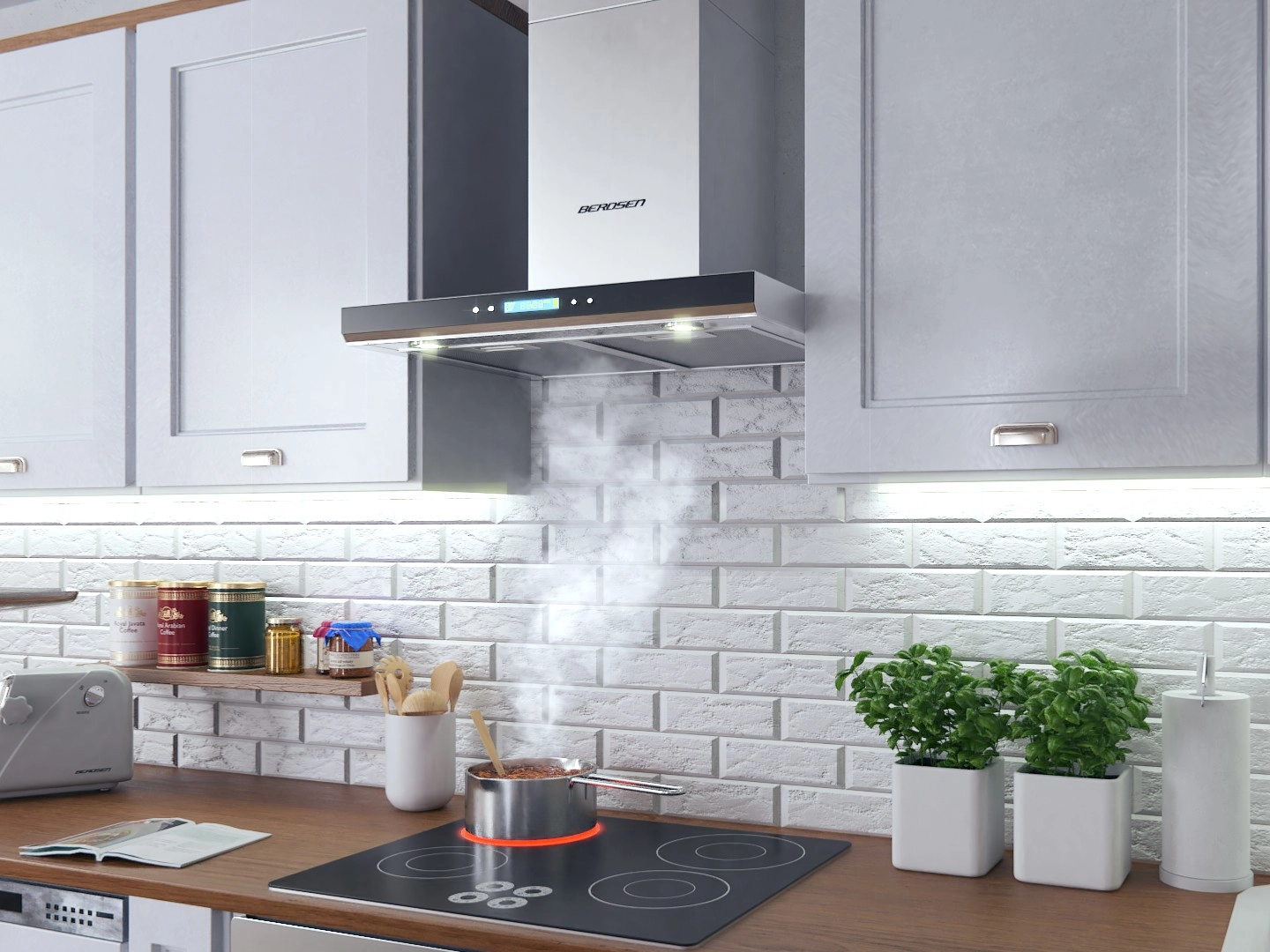 Two economical LEDs (2 × 1 W) with a natural light color improve visibility while cooking and save energy.