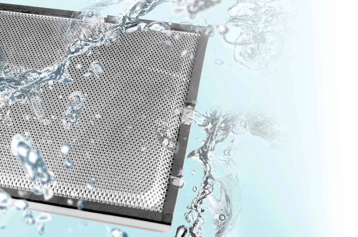 Reinforced 3-layer aluminum grease filters (2 pcs) trap grease and dust, protect the motor, and can be conveniently rinsed under running water.