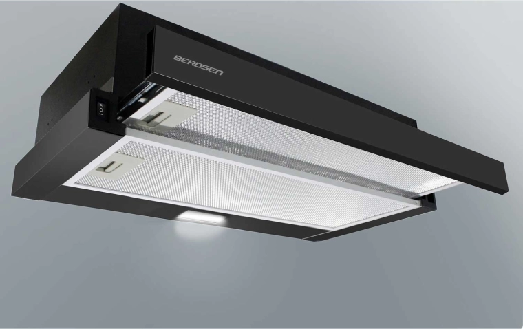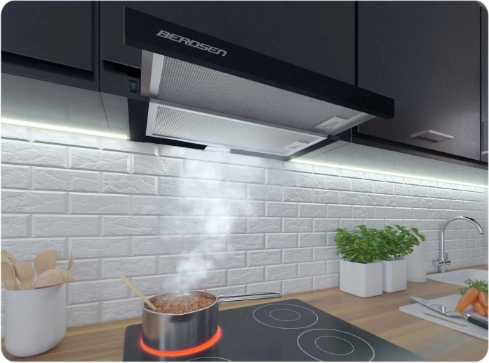 The compact telescopic BERDSEN cooker hood, 50 cm wide in elegant black, offers powerful extraction up to 200 m³/h, 2 operating modes (ducted and recirculation), quiet operation and energy‑saving 2 W LED lighting. Thanks to the pull-out panel it saves space, fits any kitchen, and with aluminium multi-layer filters it is easy to keep clean.