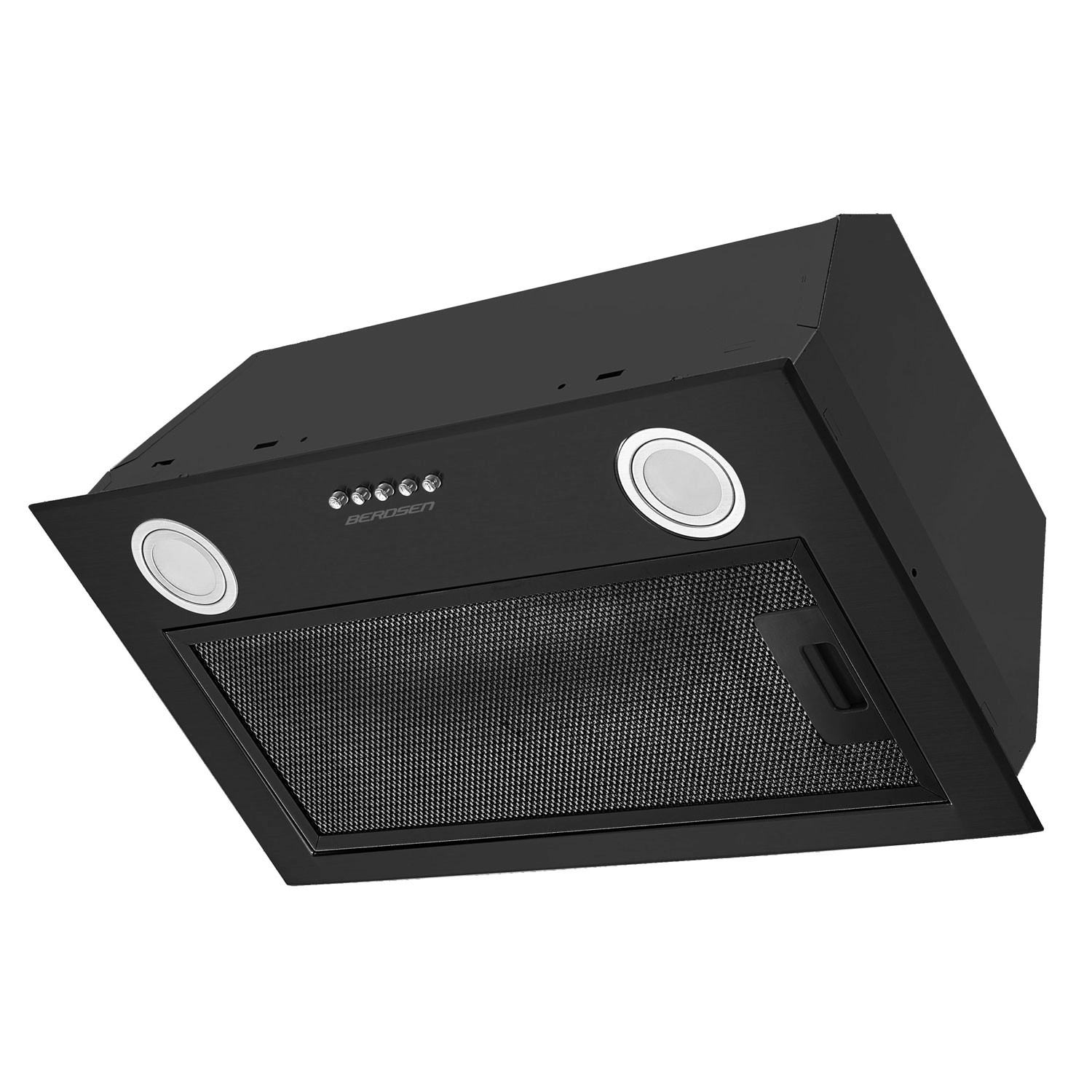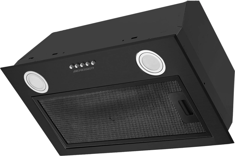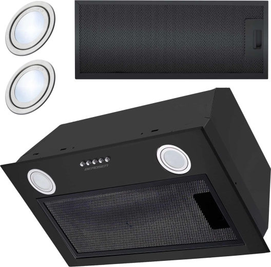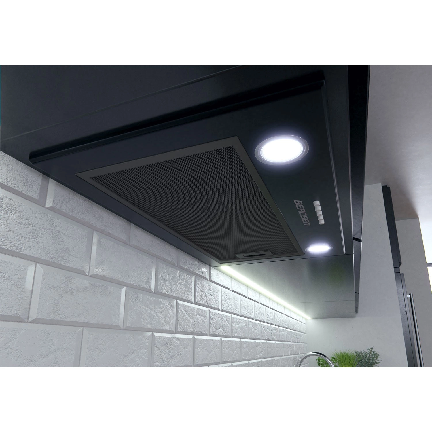 Elegant built-in cooker hood, 60 cm wide, in a black finish for discreet integration into your kitchen. Offers powerful extraction up to 380 m³/h, energy-saving LED lighting (2 × 2 W), and three-speed manual control. Thanks to the 5-layer aluminum grease filter, it effectively traps grease, reduces dirt buildup, and helps keep your kitchen clean.