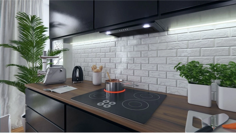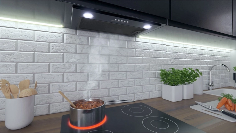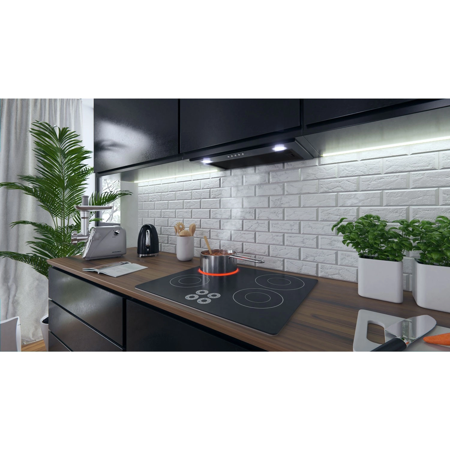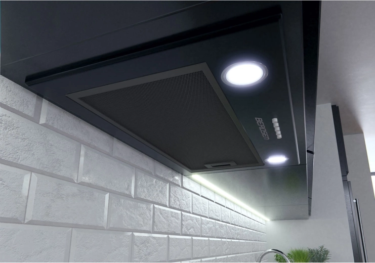 A discreet and practical cooker hood that becomes a natural part of your kitchen. The minimalist black design pairs perfectly with modern cabinetry, while the powerful motor ensures extraction of steam, odors, and moisture. Integrated LED lighting evenly illuminates the cooktop and enhances cooking comfort.