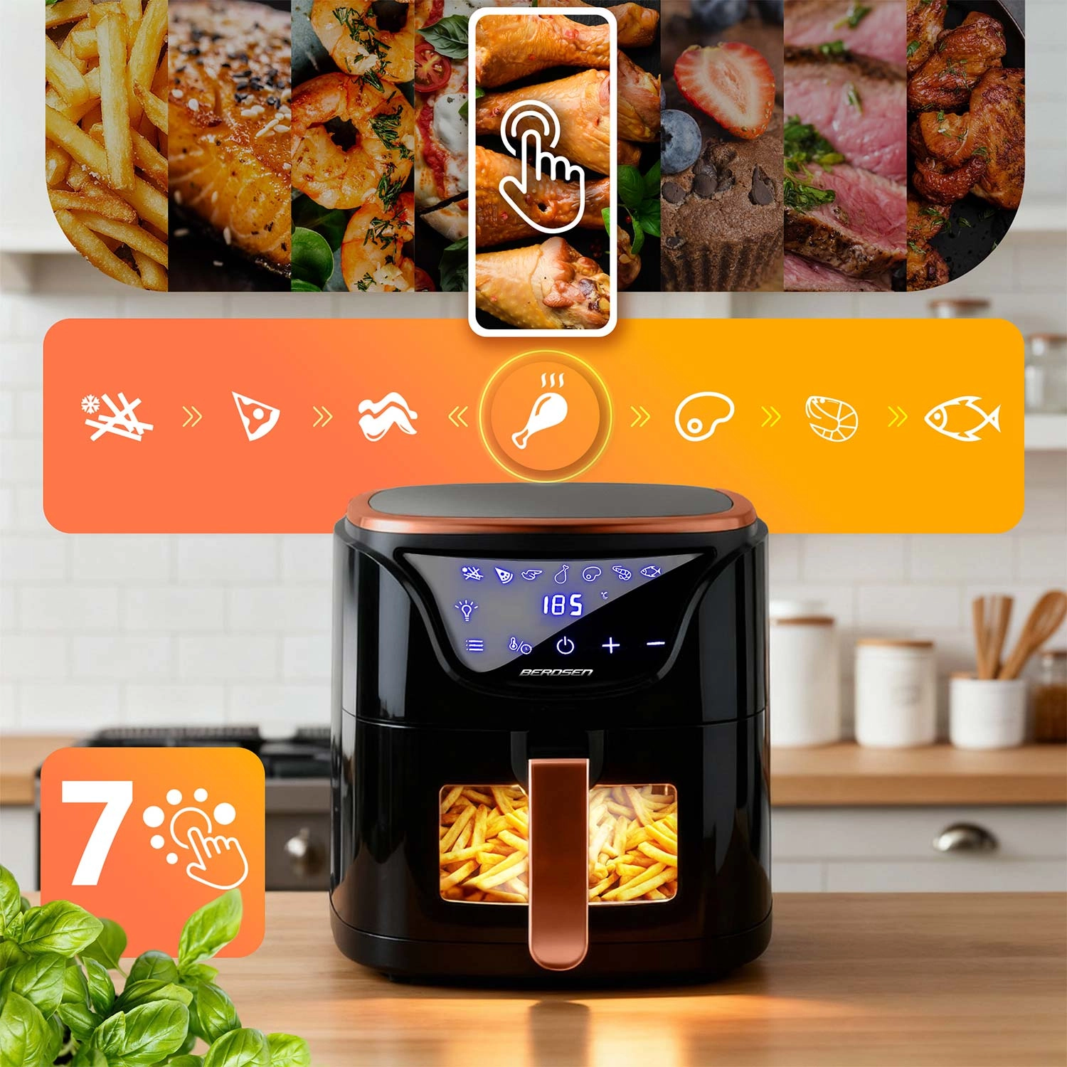 BERDSEN BD‑652 combines 1500 W of power, an elegant black design with copper/rose‑gold accents, and smart features for everyday cooking without unnecessary oil. The intuitive touch panel with clear icons and a window with LED backlight let you keep meals under control at all times—without interrupting baking. The spacious 5 L basket comfortably handles a family lunch or a large portion of fries for friends.