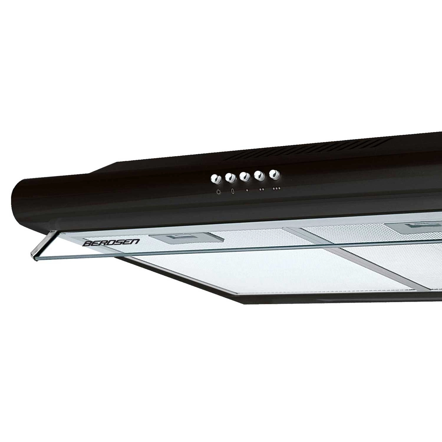 The compact 50 cm BERDSEN under-cabinet cooker hood in elegant black offers high efficiency up to 205 m³/h, quiet mechanical controls, and energy-saving LED lighting. Thanks to the 5-layer aluminum filter, it reliably traps grease and can operate as ducted extraction or recirculation with an optional carbon filter.
