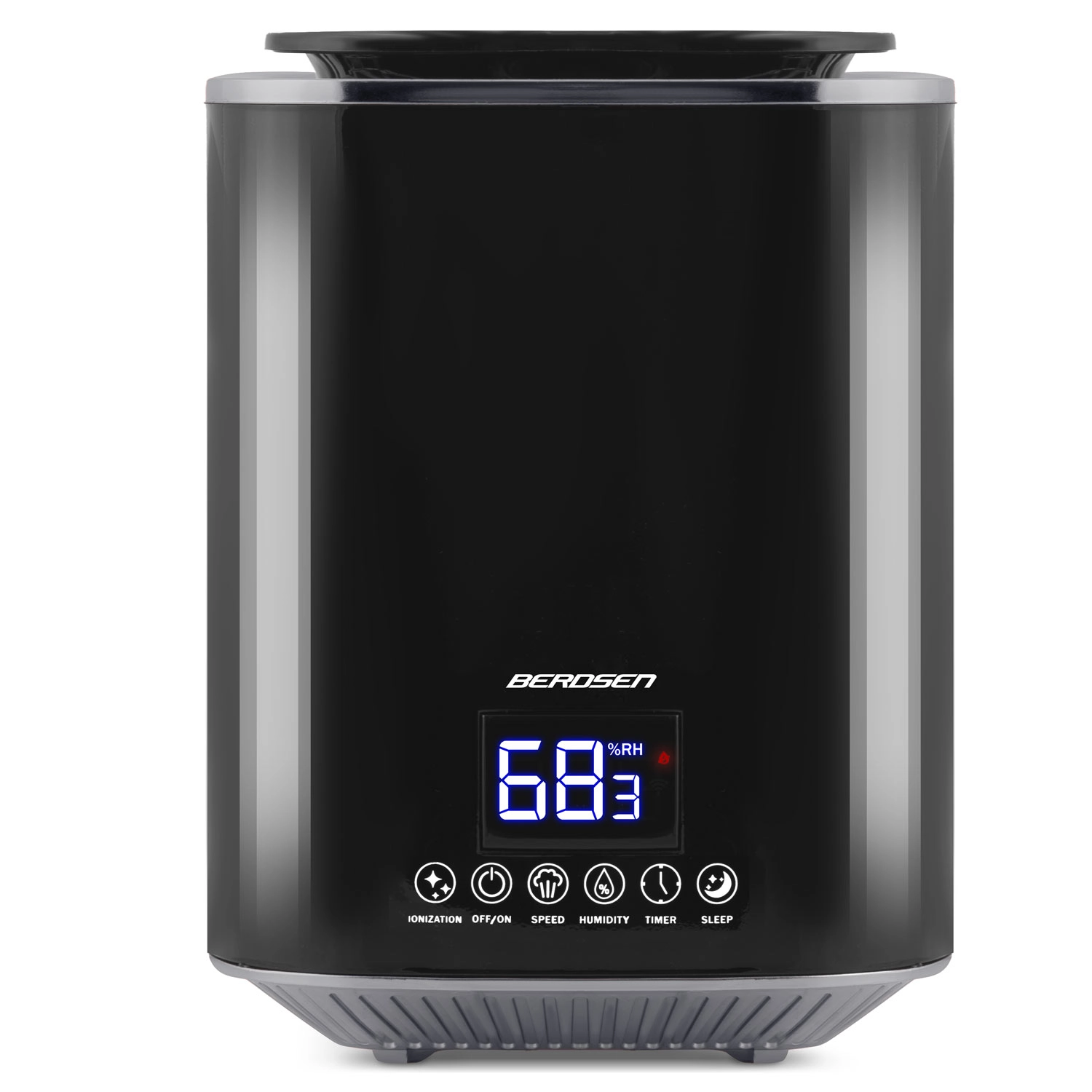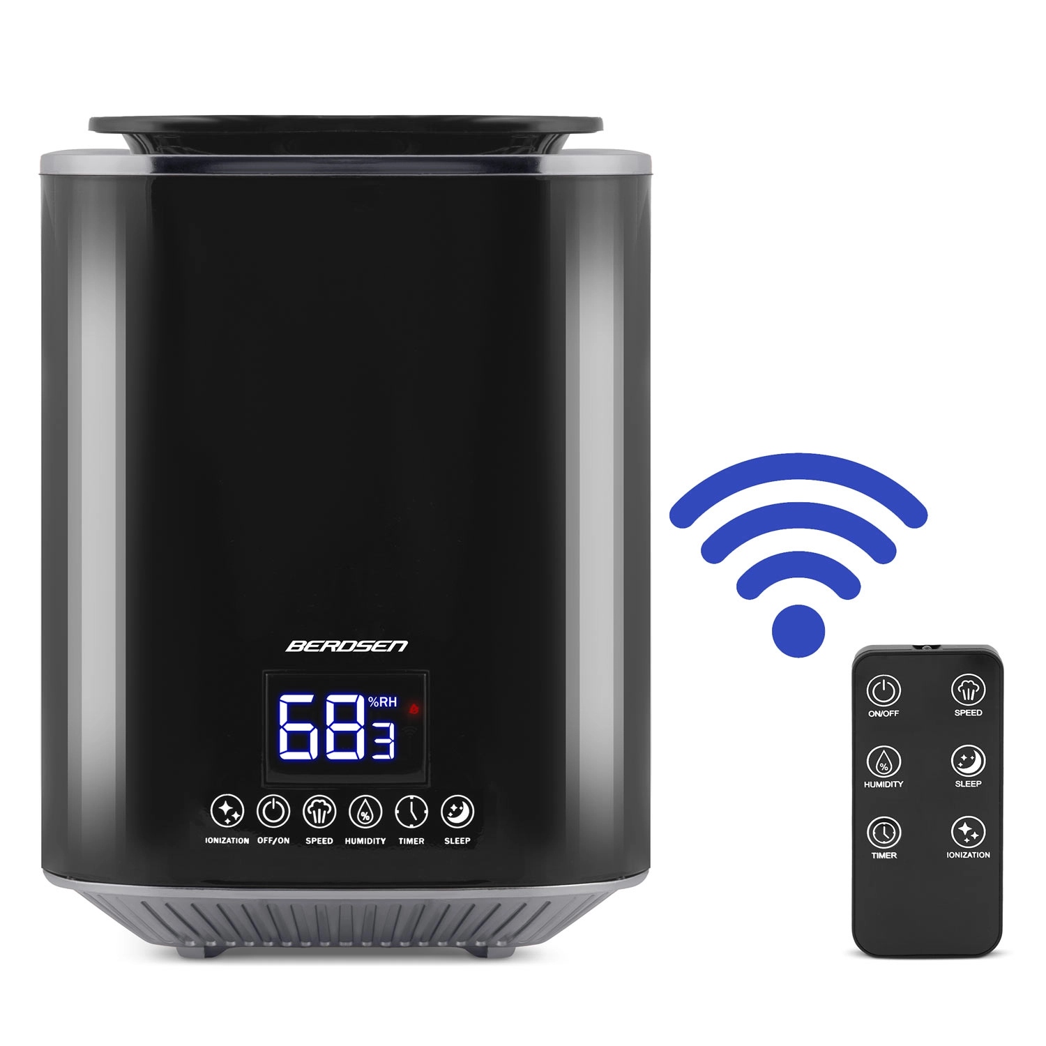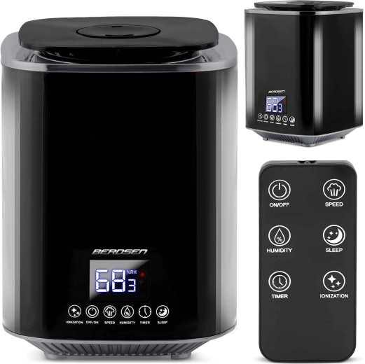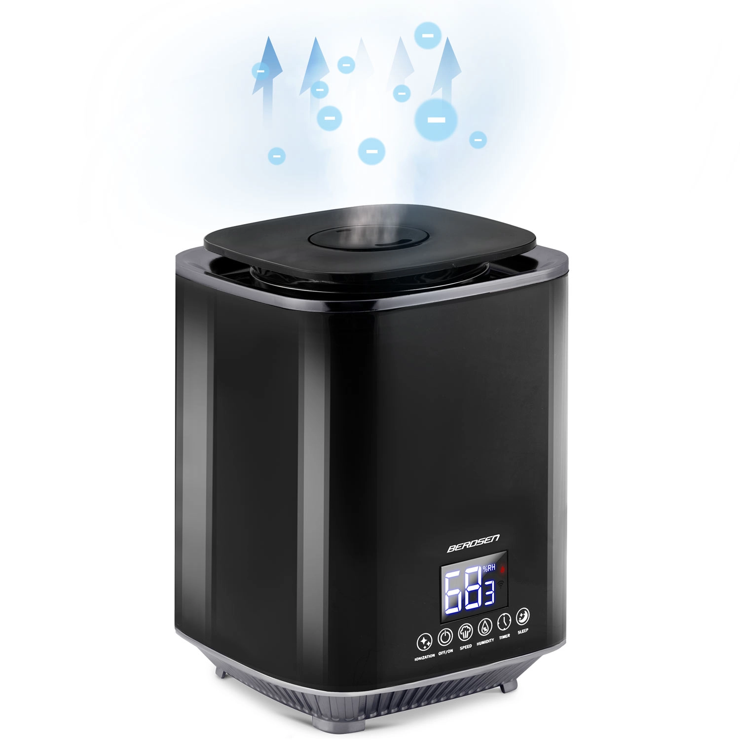 The modern BERDSEN ultrasonic air humidifier with ionization and aromatherapy ensures a healthy climate at home and in the office. It offers output up to 250 ml/h, a large 2.6 l tank, precise humidity control via a hygrostat 45–90% and a built-in hygrometer. Convenient operation is provided by a touch LED panel and a remote control; it also includes a timer, night mode, and automatic shut-off when the tank is empty.
