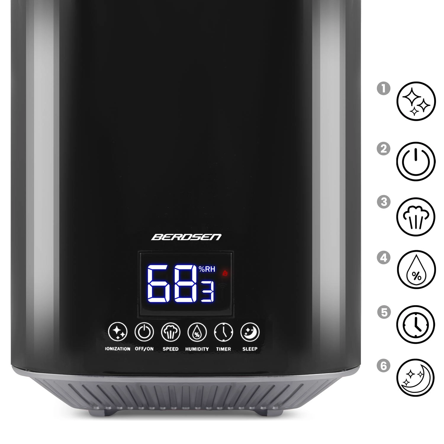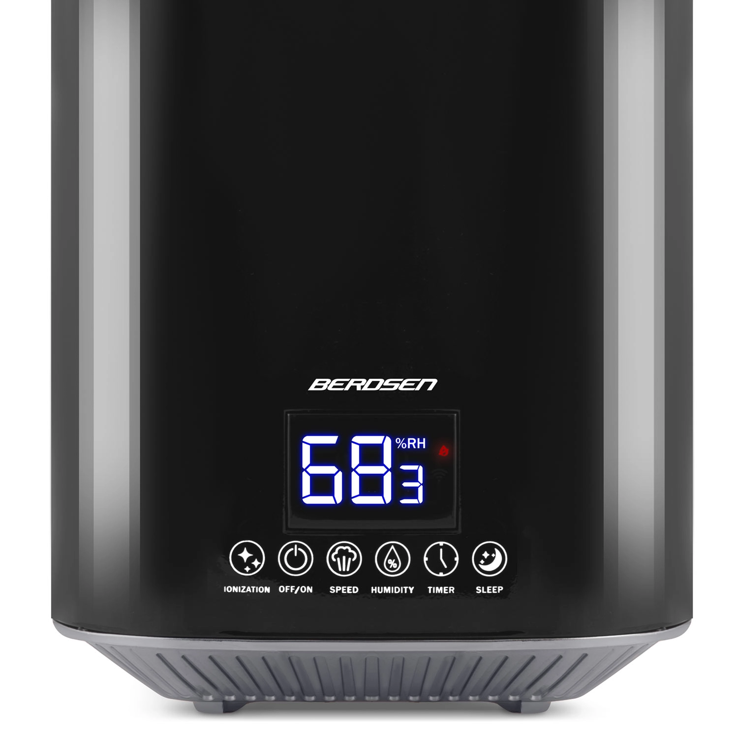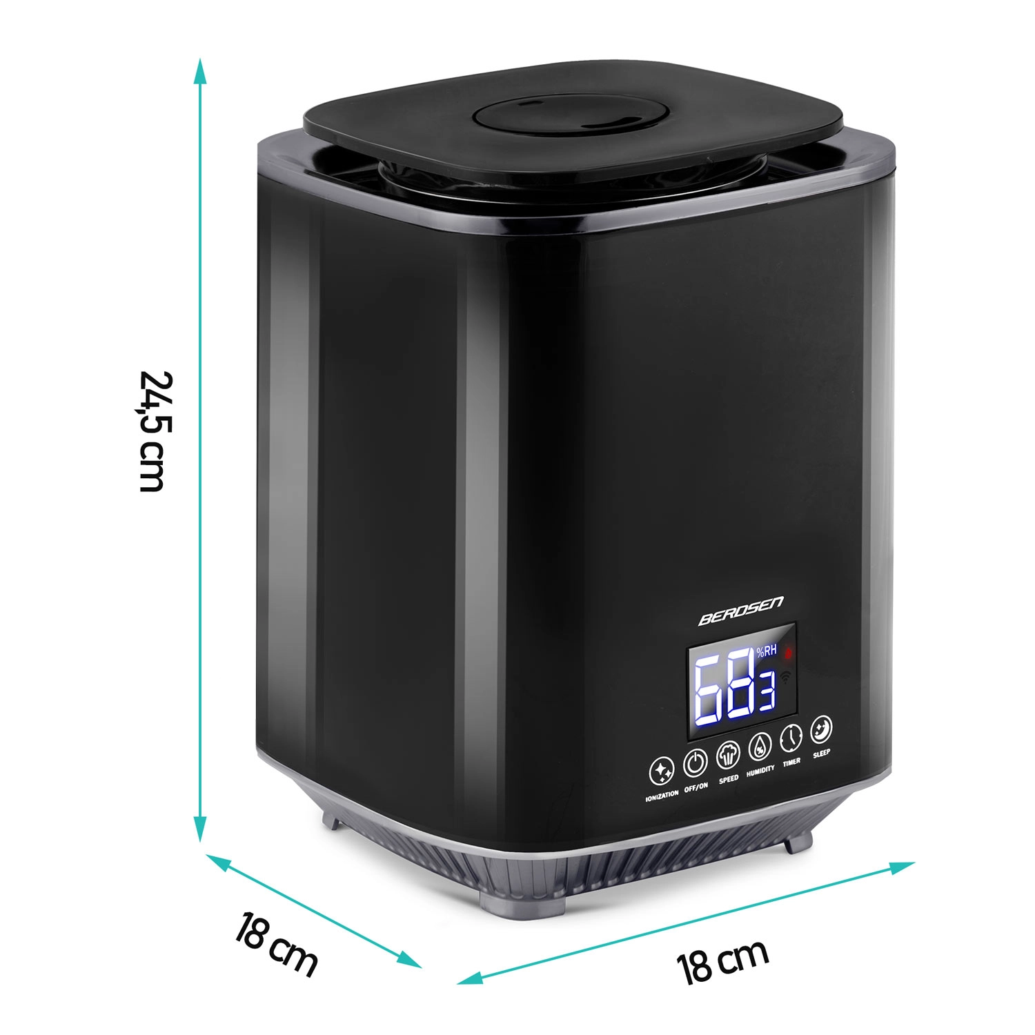 The modern BERDSEN ultrasonic air humidifier with ionization and aromatherapy ensures a healthy climate at home and in the office. It offers output up to 250 ml/h, a large 2.6 l tank, precise humidity control via a hygrostat 45–90% and a built-in hygrometer. Convenient operation is provided by a touch LED panel and a remote control; it also includes a timer, night mode, and automatic shut-off when the tank is empty.