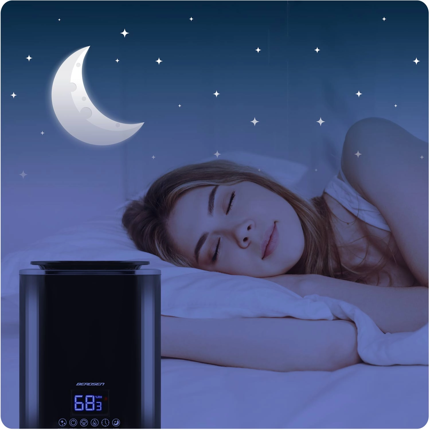 The smart hygrostat (45–90%) maintains the set humidity and switches the device to standby once reached. Night mode dims the display and the unit continues to run quietly. Intuitive touch controls are complemented by a 1–9 h timer and practical automatic shut-off when water is low.