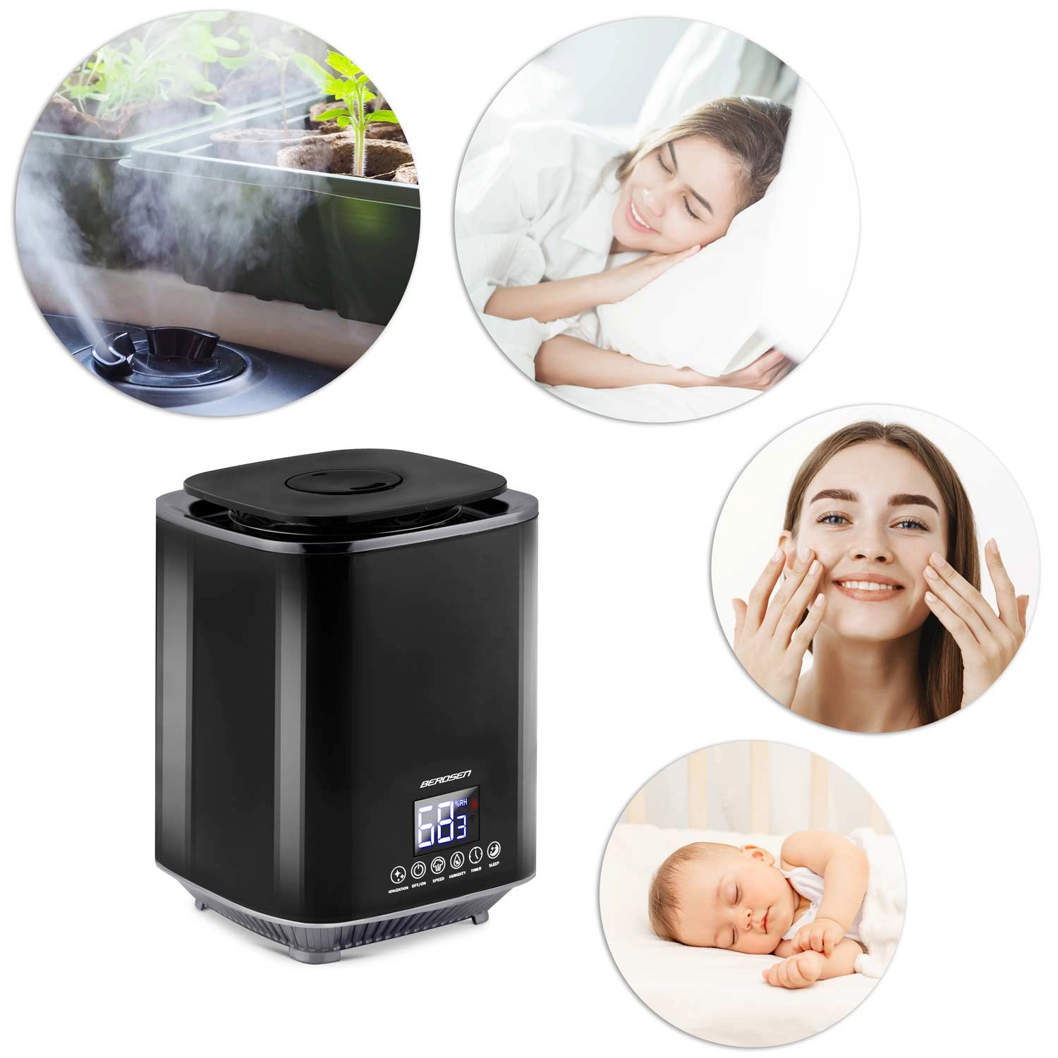 Relieve your airways, skin, and plants. Thanks to its fine cool mist, the BERDSEN humidifier quickly raises humidity, while ionization helps neutralize dust and allergens. The aromatherapy function lets you add your favorite essential oil (2–3 drops) to scent the interior and promote relaxation.