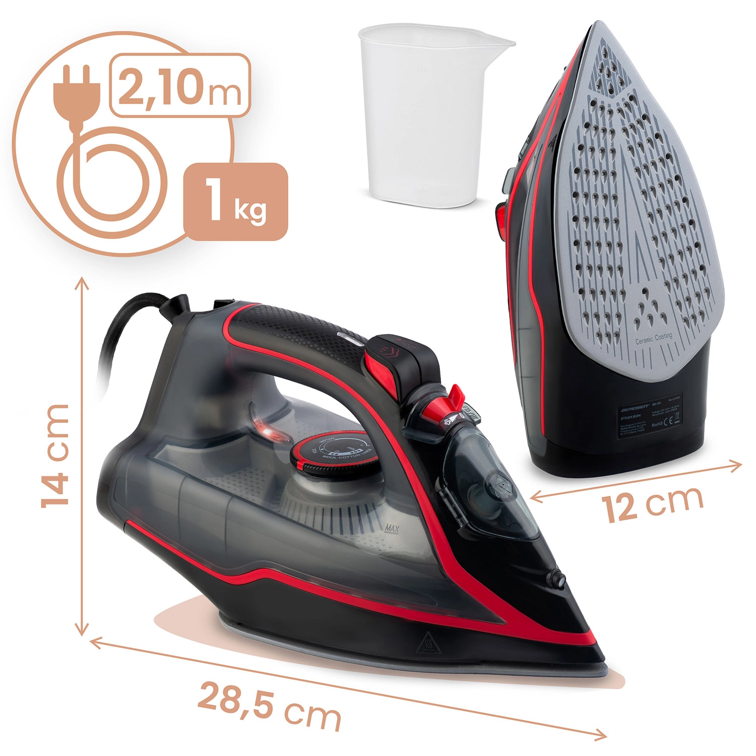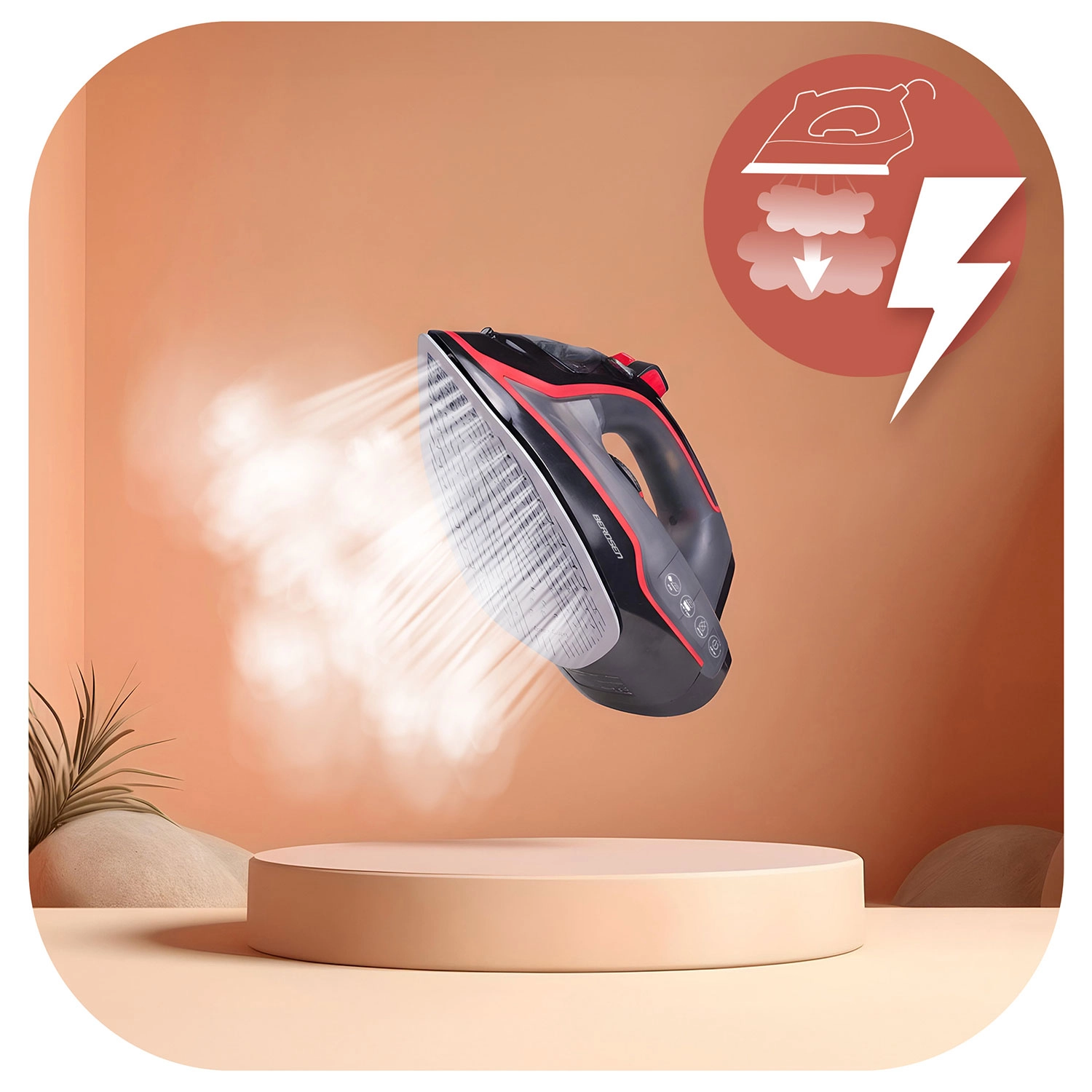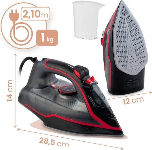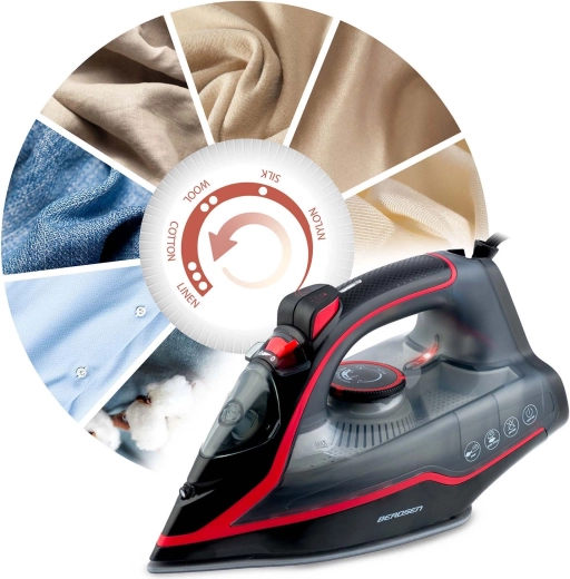 The powerful Berdsen steam iron with 2600 W ensures fast, smooth ironing with ease. It features a ceramic soleplate with micro-channels for even steam distribution, temperature and steam control, a vertical steaming function, auto shut-off, and a Self Clean program for easy maintenance. A practical sprayer, 360° swivel cord, and a 230 ml water tank increase comfort in everyday use.
