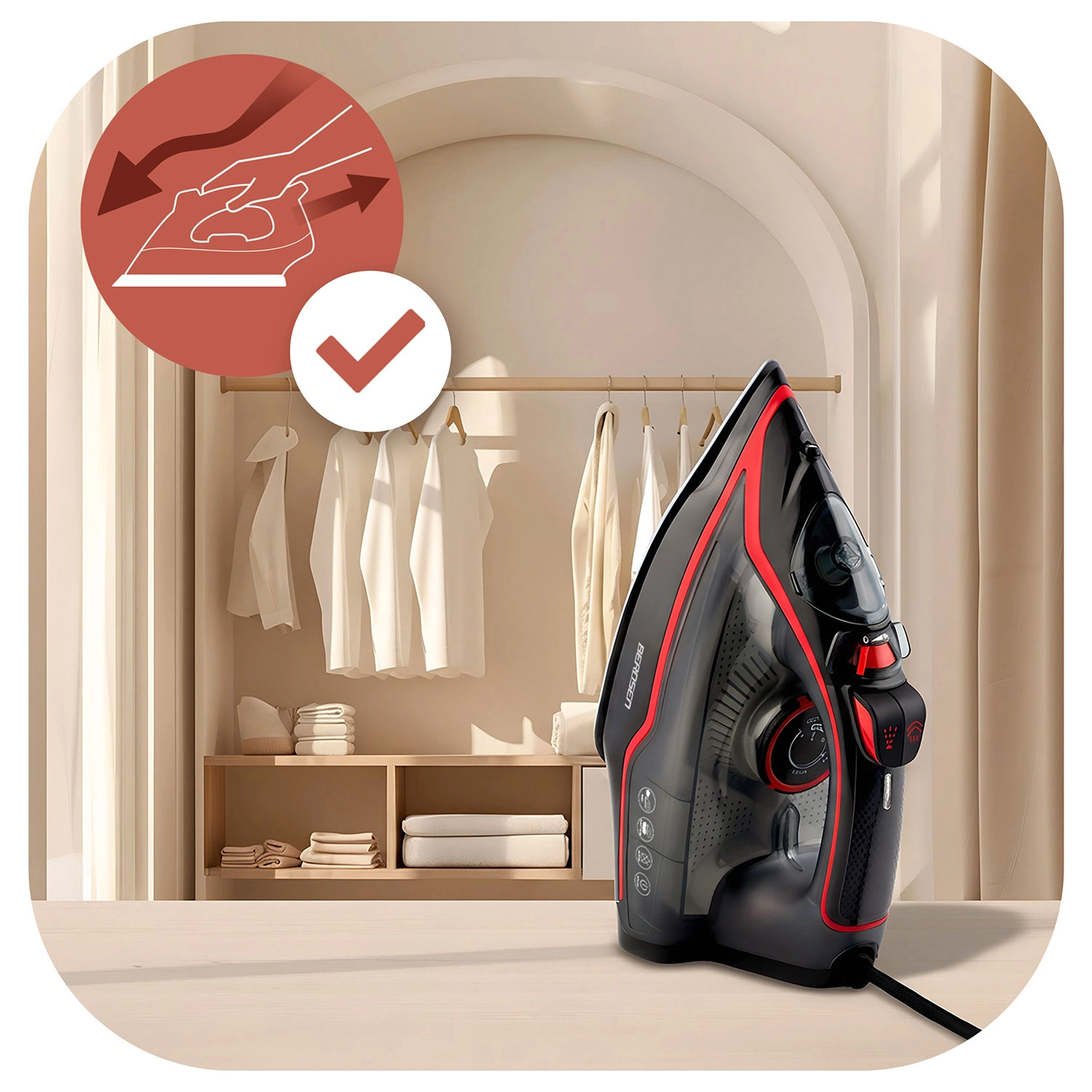 Iron exactly the way you need: adjust the steam control and temperature to suit the fabric, use vertical steaming for curtains or clothes on hangers, and tame the toughest creases with the sprayer. The Self Clean function makes maintenance easy and extends the appliance’s lifespan, while the 360° swivel cord ensures freedom of movement without tangling.