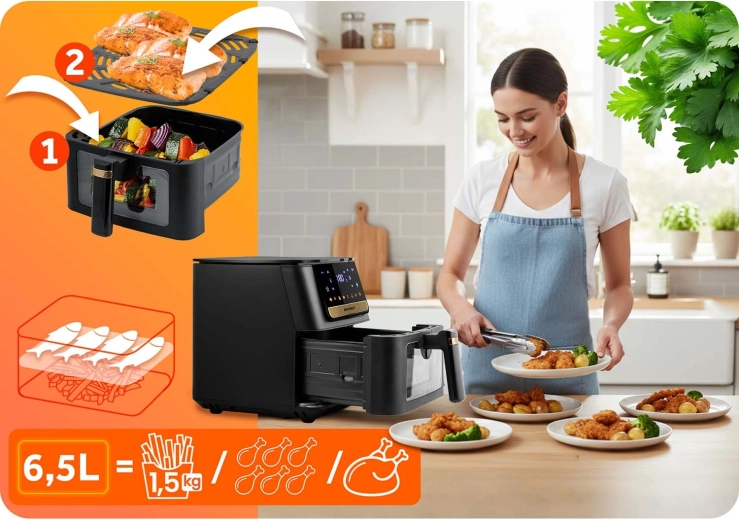 - Large 6.5 L capacity for family portions and a whole pizza