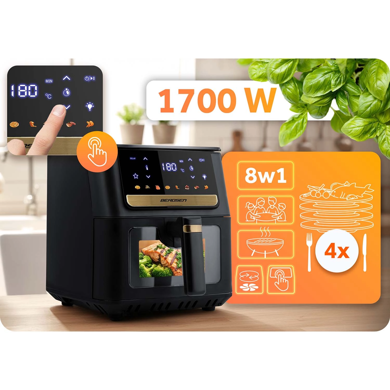 The BERDSEN air fryer delivers fast, even cooking of your favorite dishes without unnecessary oil. The large 6.5 L basket holds portions for the whole family—from fries, wings, and steaks to a whole chicken. LED lighting and a viewing window let you keep an eye on everything without interrupting cooking, while the touch display offers clear icons and presets for easy program selection.