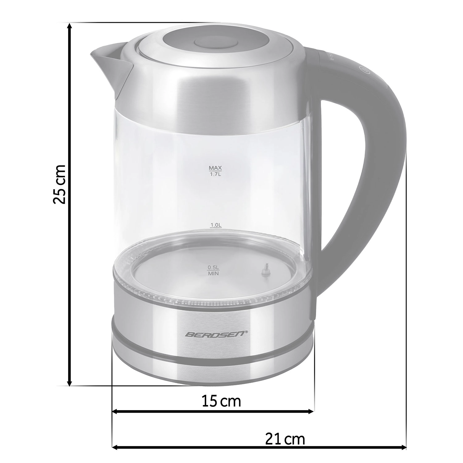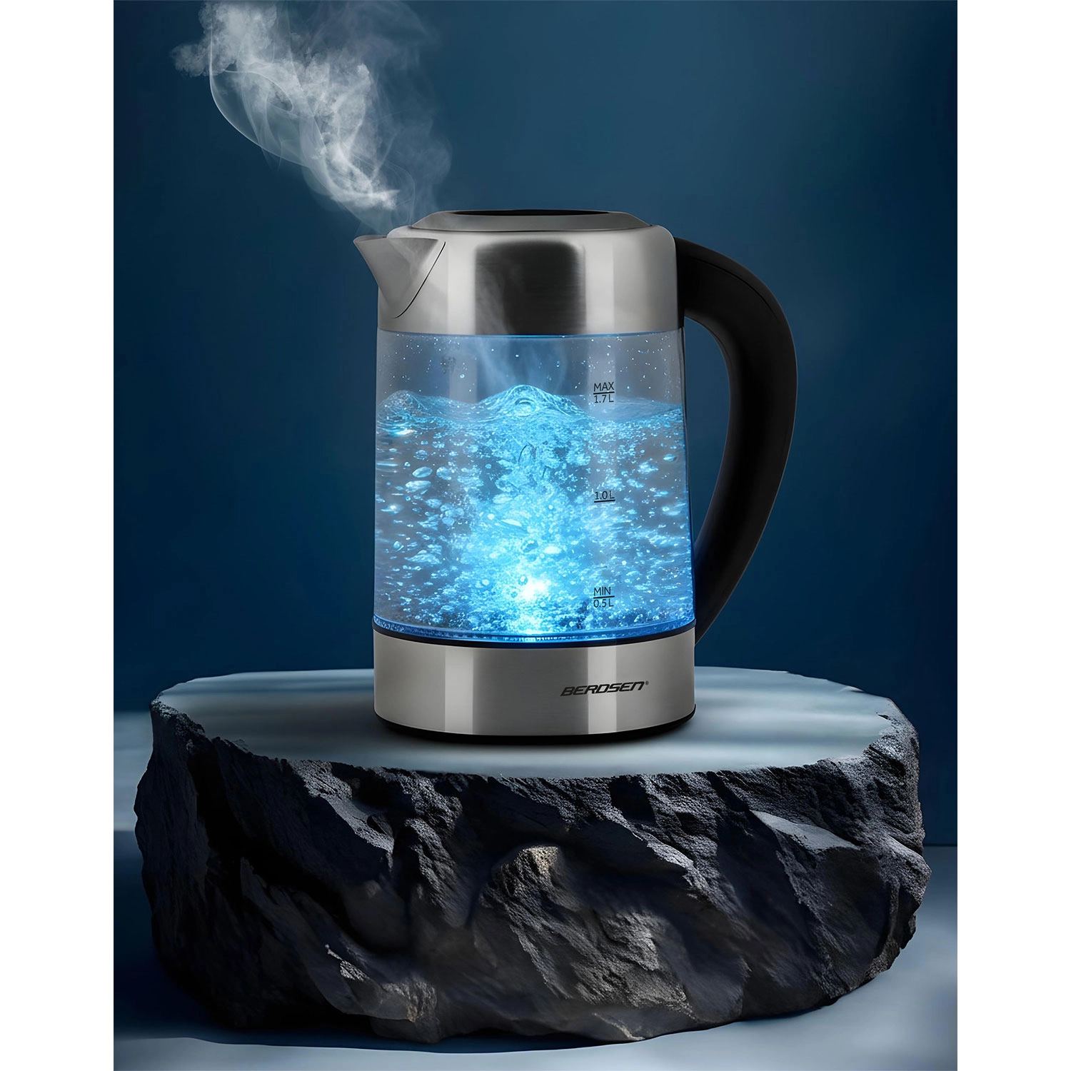 Discover the modern BERDSEN glass kettle with a 1.7 l capacity and 2200 W power for fast and precise water heating. With touch controls, smart real-time temperature monitoring, and temperature settings from 60–100 °C, you can prepare tea, coffee, and baby drinks exactly as needed. The LED backlight indicates the heating stage, borosilicate glass ensures pure taste and durability, and the boil-dry protection keeps usage safe and worry-free.