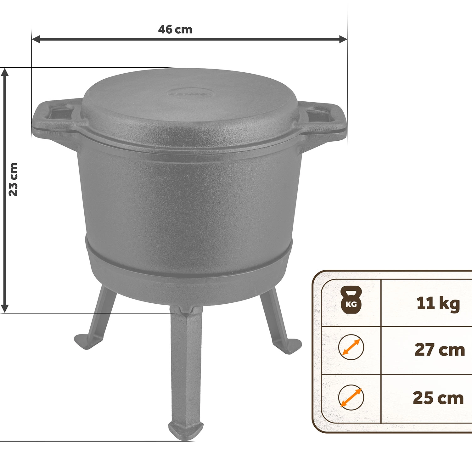 A robust 8 L iron cauldron with a reversible lid that also serves as a pan, ideal for cooking over an open fire or on a grill. Thanks to the thick-walled cast-iron body, it stores and distributes heat evenly, so goulash, roasts, and beans are always perfectly cooked through. The stable three-legged stand and practical handles make handling easy even on uneven ground. The package also includes cauldron recipes to kick-start your outdoor cooking.