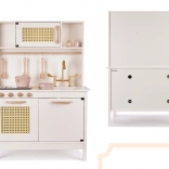 A stylish children’s kitchen in retro BOHO design that delivers hours of creative play. It features a deep sink with a gold faucet, control knobs, an oven with a rattan-style panel, practical shelves and cabinets, and abundant wooden accessories. Thanks to the light and sound effects of the burners, play feels realistic and develops imagination and fine motor skills.