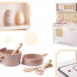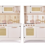 This wooden kitchen inspired by retro and boho styles stands out with an elegant combination of white, cream, and gold details. Most elements are made of wood/MDF; the surface is smoothly sanded and painted with non-toxic paints for safe play. Rotating knobs, opening doors, and utensil hooks invite exploration and teach kids organization and tidiness.