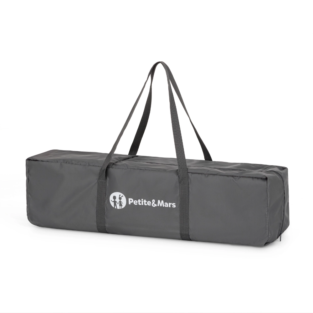 The lightweight and compact PETITE&MARS Koot Lite travel cot in elegant dark grey is ideal for trips and home alike. It offers a stable metal frame, breathable mesh sides for better air circulation, and a Double Lock safety system to prevent accidental folding. It folds easily, fits into the carry bag, and is suitable for children up to 15 kg.