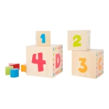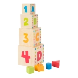 The wooden shape-sorting blocks ABC small foot are an ideal educational toy for early learning. Children insert the correct shapes into matching cutouts, stack the blocks, and use the prints to get to know letters and numbers. Through play they practice recognizing shapes and colors, counting, and the alphabet.