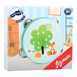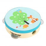 The tambourine is decorated with animal illustrations such as a fox, hedgehog, and owl, making it especially appealing to children.