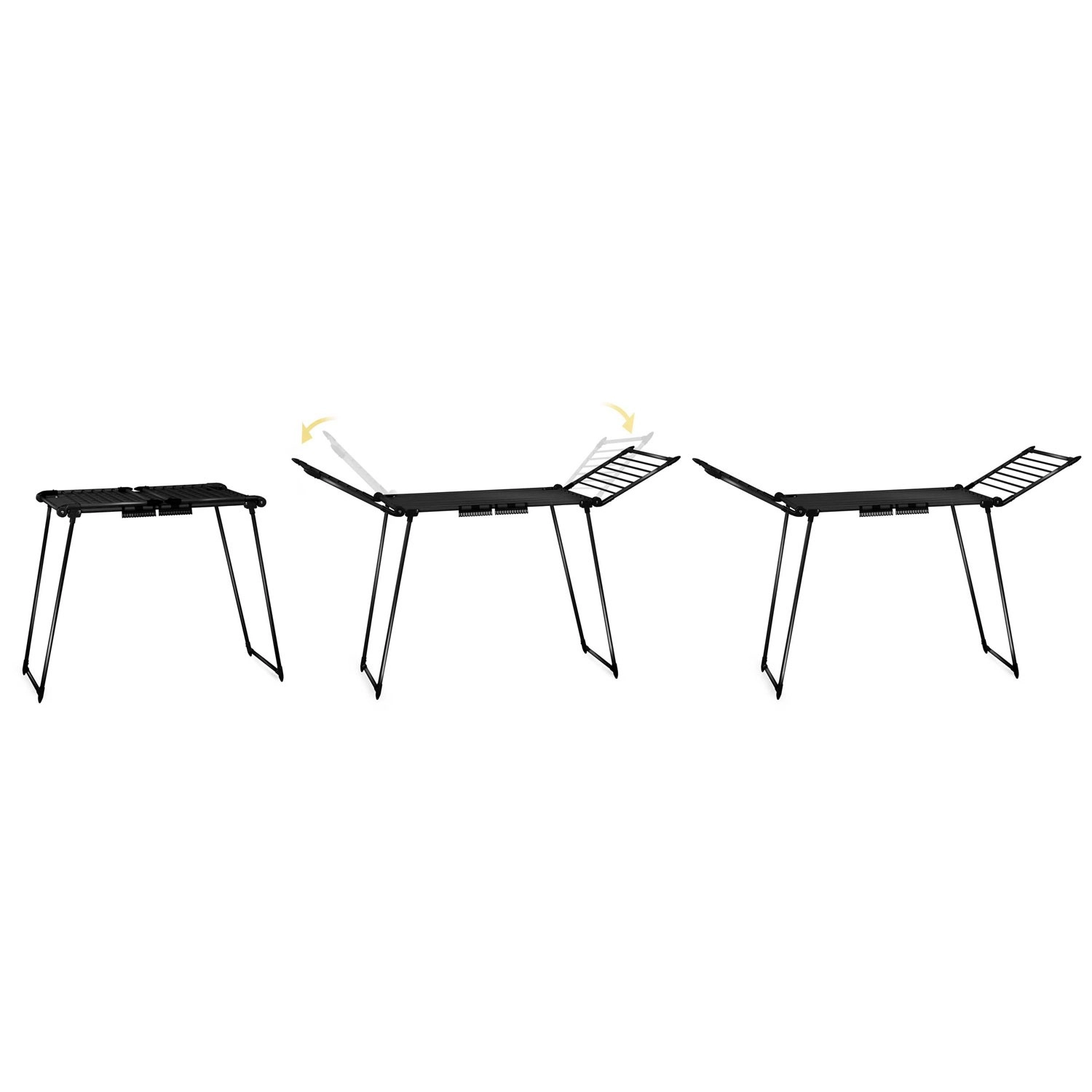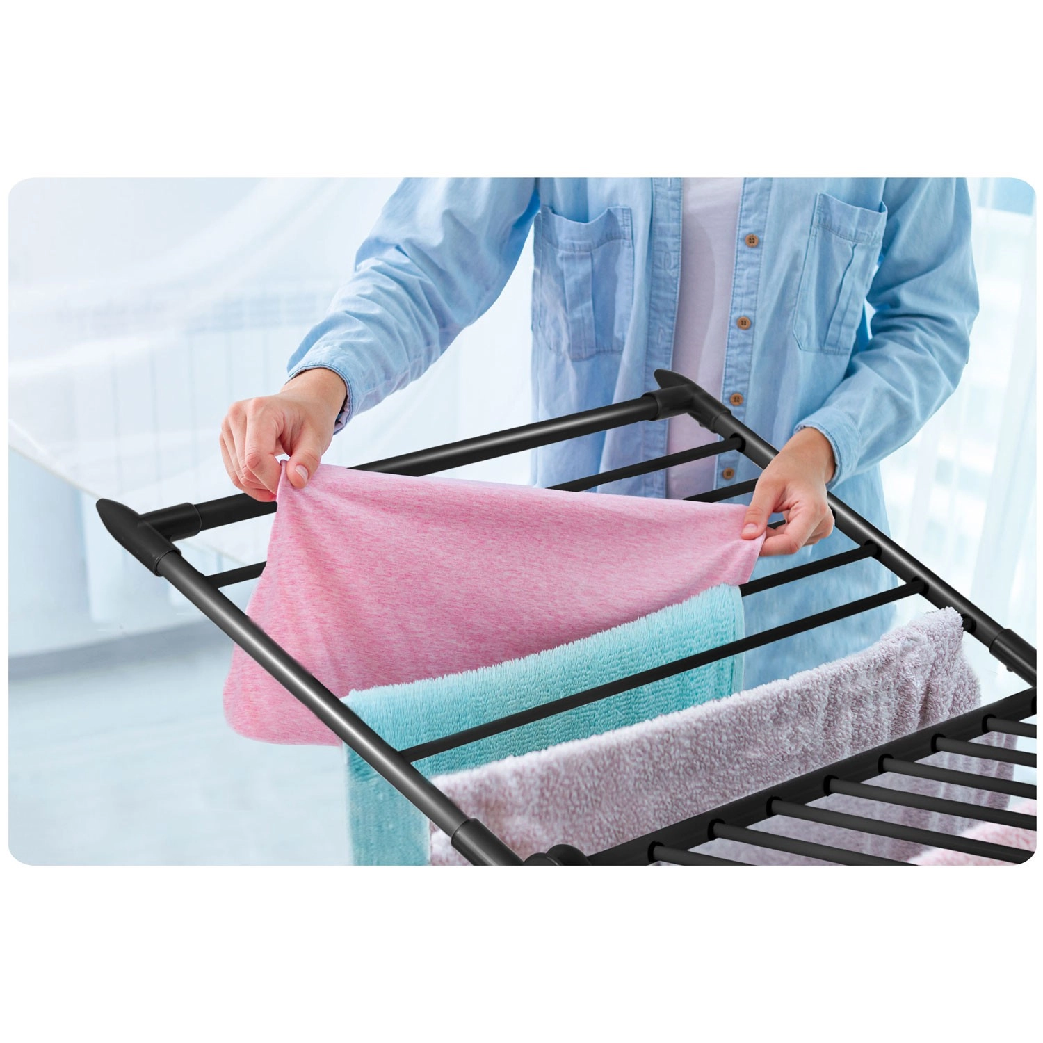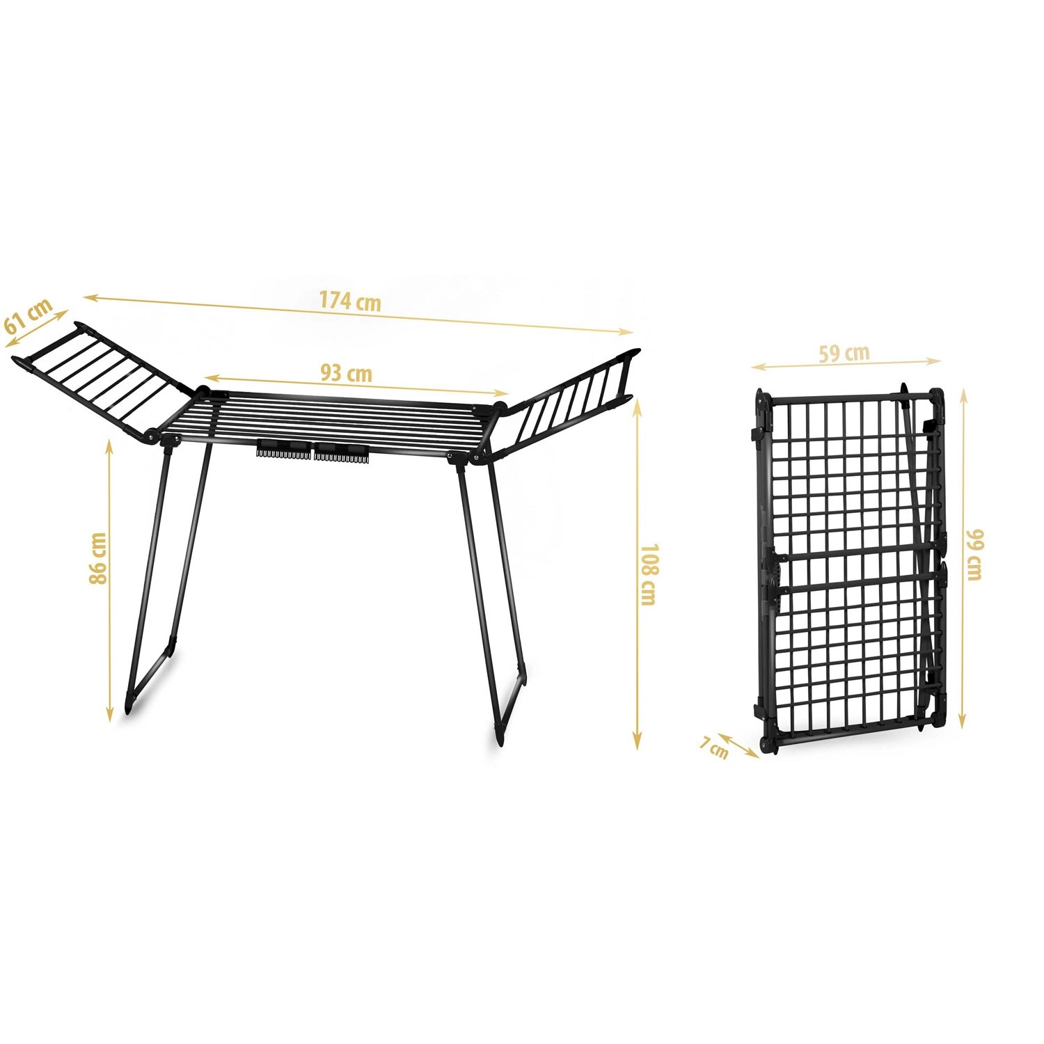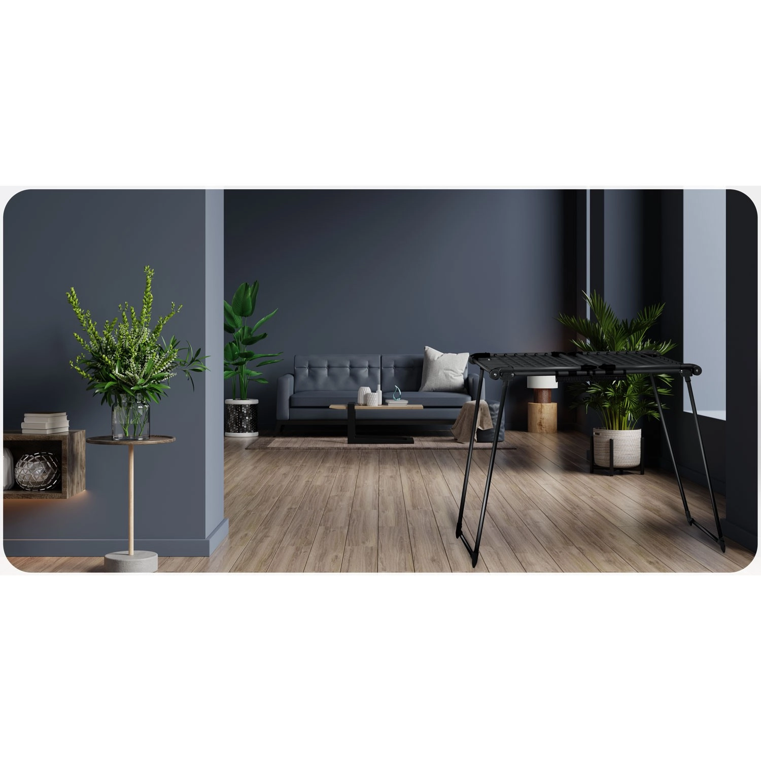 A practical black clothes dryer with up to 19 m of drying space, featuring folding wings, holders for small laundry, and non-slip feet. Thanks to the thicker rods, it reduces creasing and ensures fast, even drying. Ideal for everyday use at home and on the balcony.