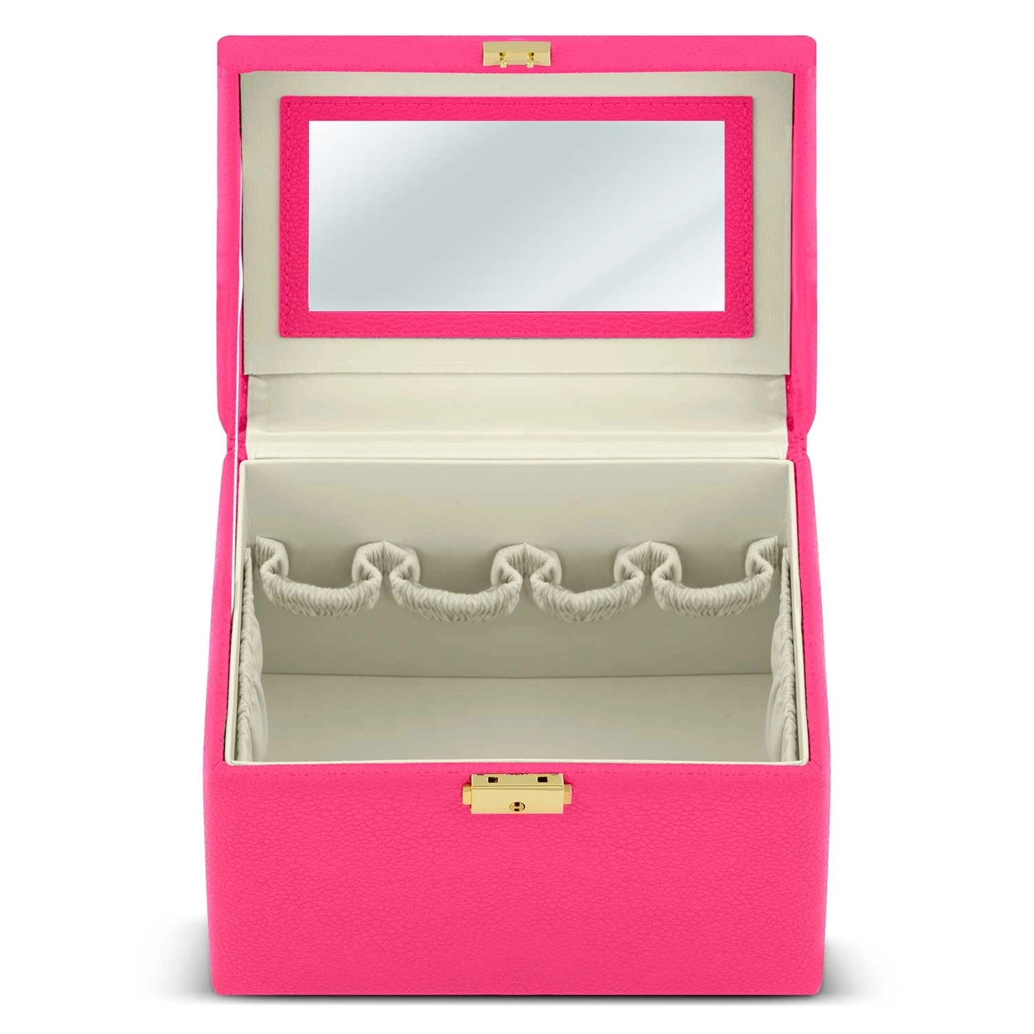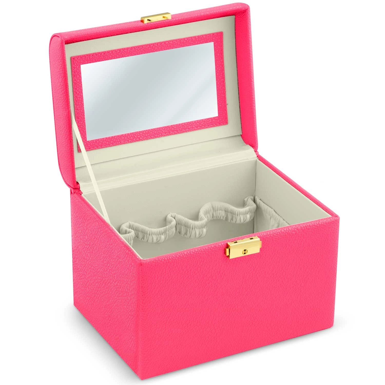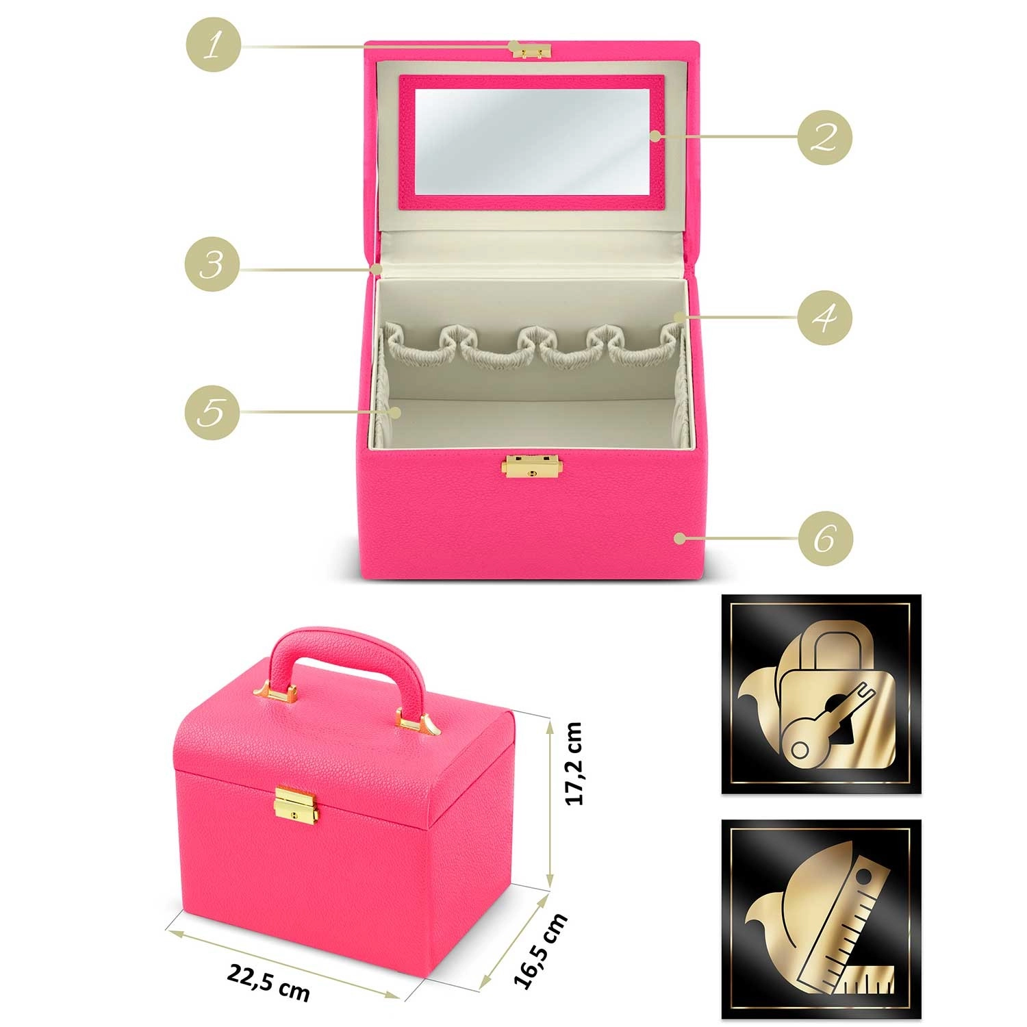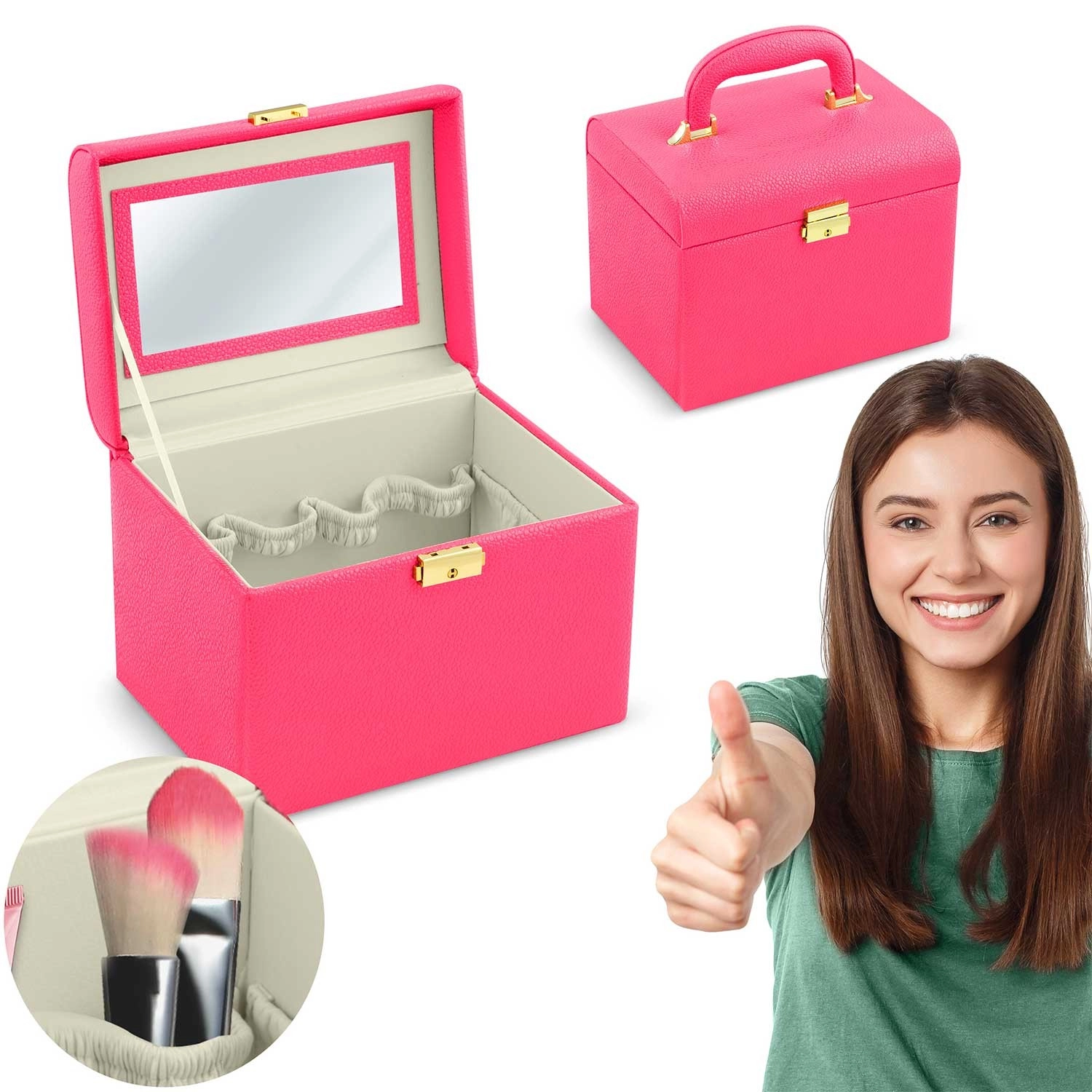 Durable PU eco leather protects the contents from scratches and wear, while the lock prevents accidental opening during travel. Inside you’ll find a mirror, elastic pockets, and compartments for brushes, lipsticks, jewelry, and small accessories — all neatly and safely stored.