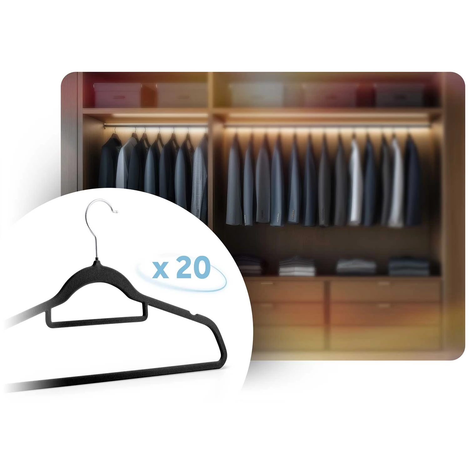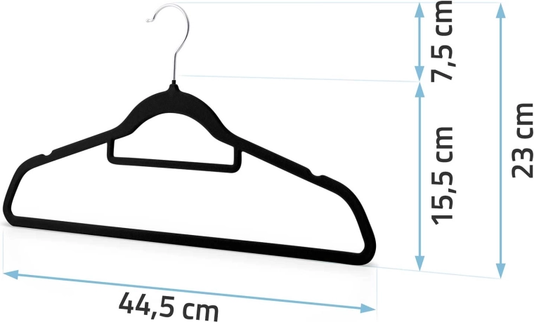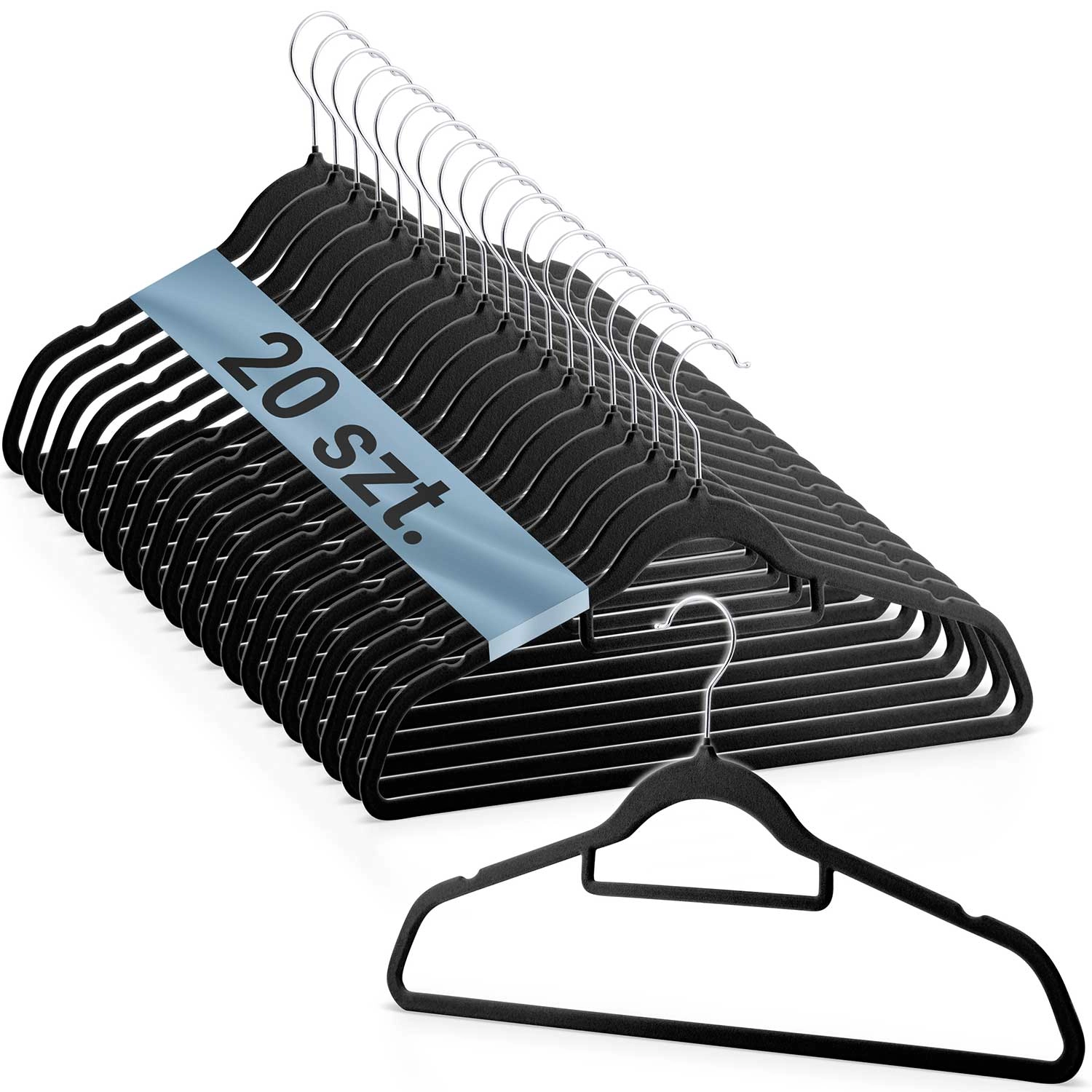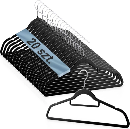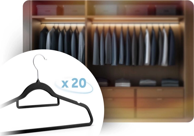 Keep your wardrobe perfectly organized with a set of 20 slim velvet hangers MASSIDO. The non-slip surface gently holds dresses, shirts, and sweaters, the rotating metal hook makes handling easy, and the bottom bar is ideal for trousers, scarves, or ties. Thanks to the notches on the shoulders, even light tops stay securely in place, and you save the maximum space in your closet.