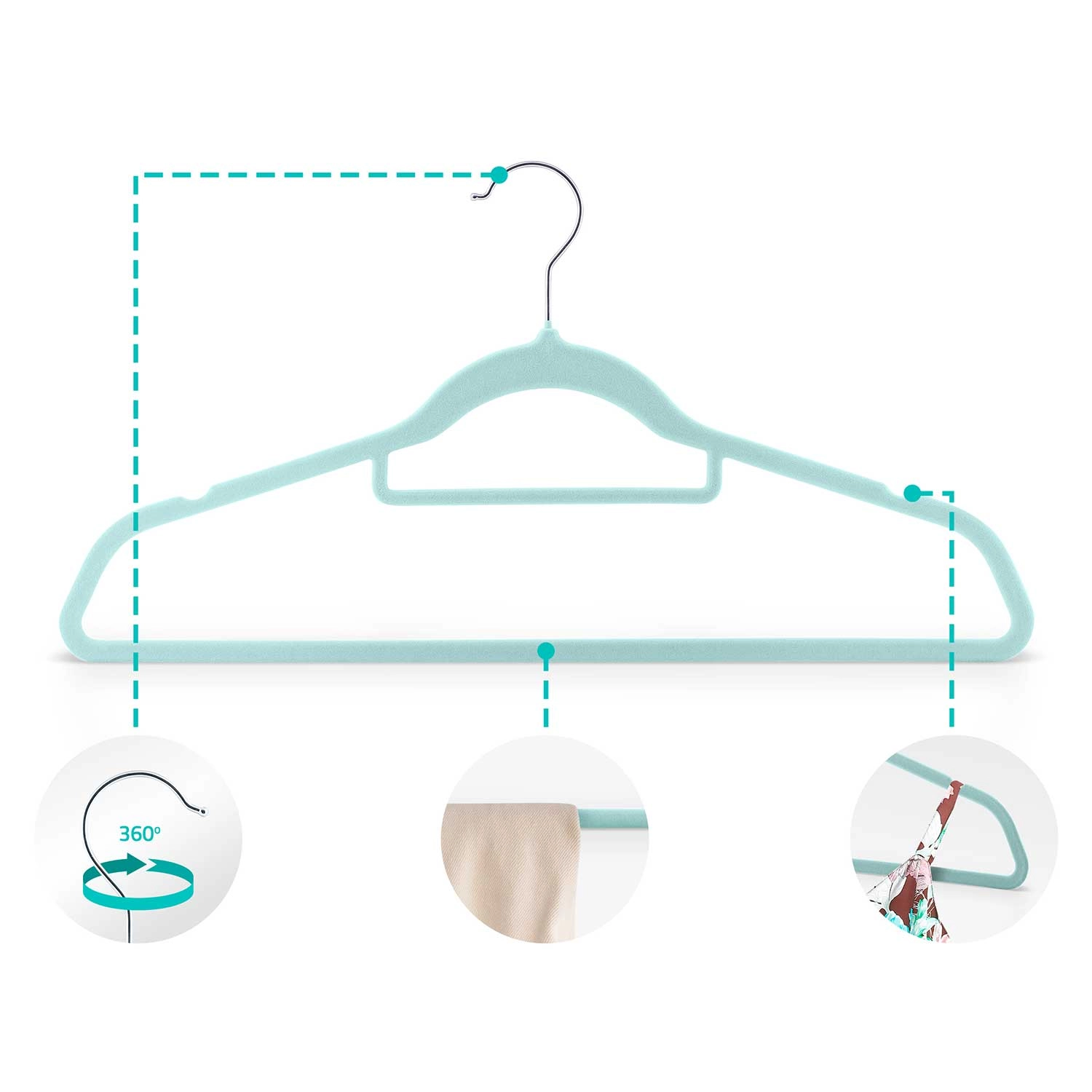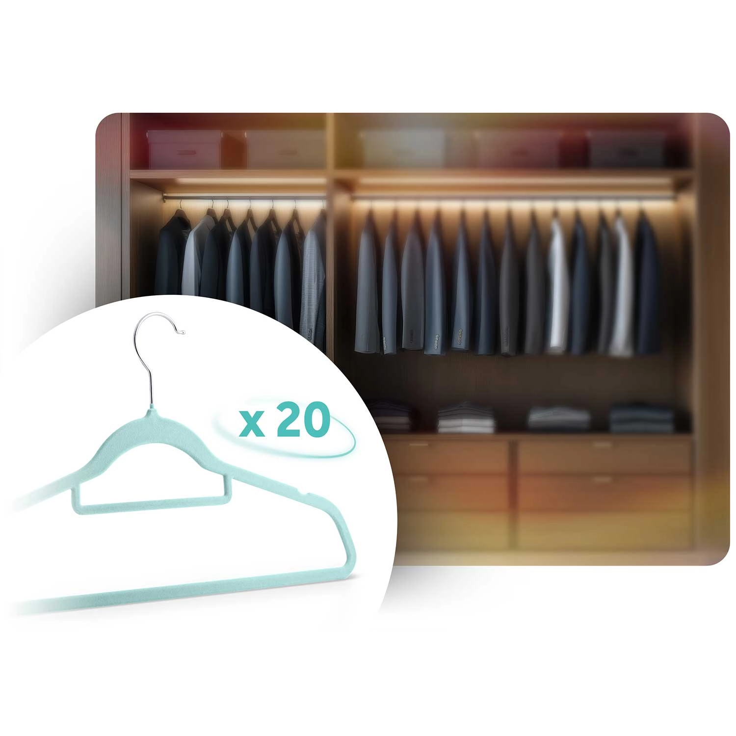 Organize your wardrobe with elegance and order thanks to the set of 20 MASSIDO velvet hangers. They feature a non-slip surface, a rotating metal hook, and a bottom bar for trousers or scarves. The slim profile saves closet space, and the shoulder notches securely hold dresses and tops with thin straps.