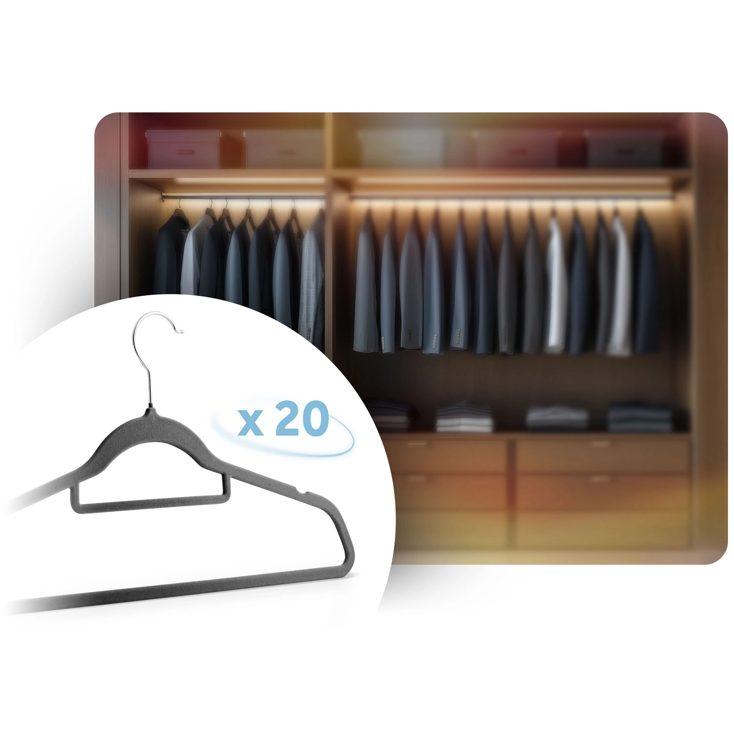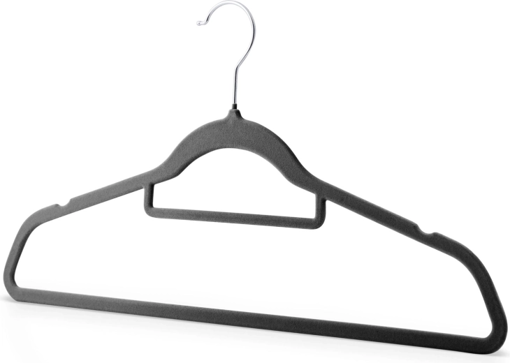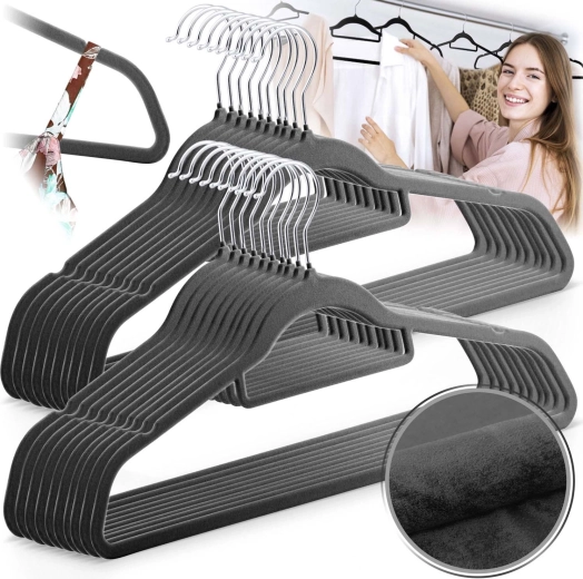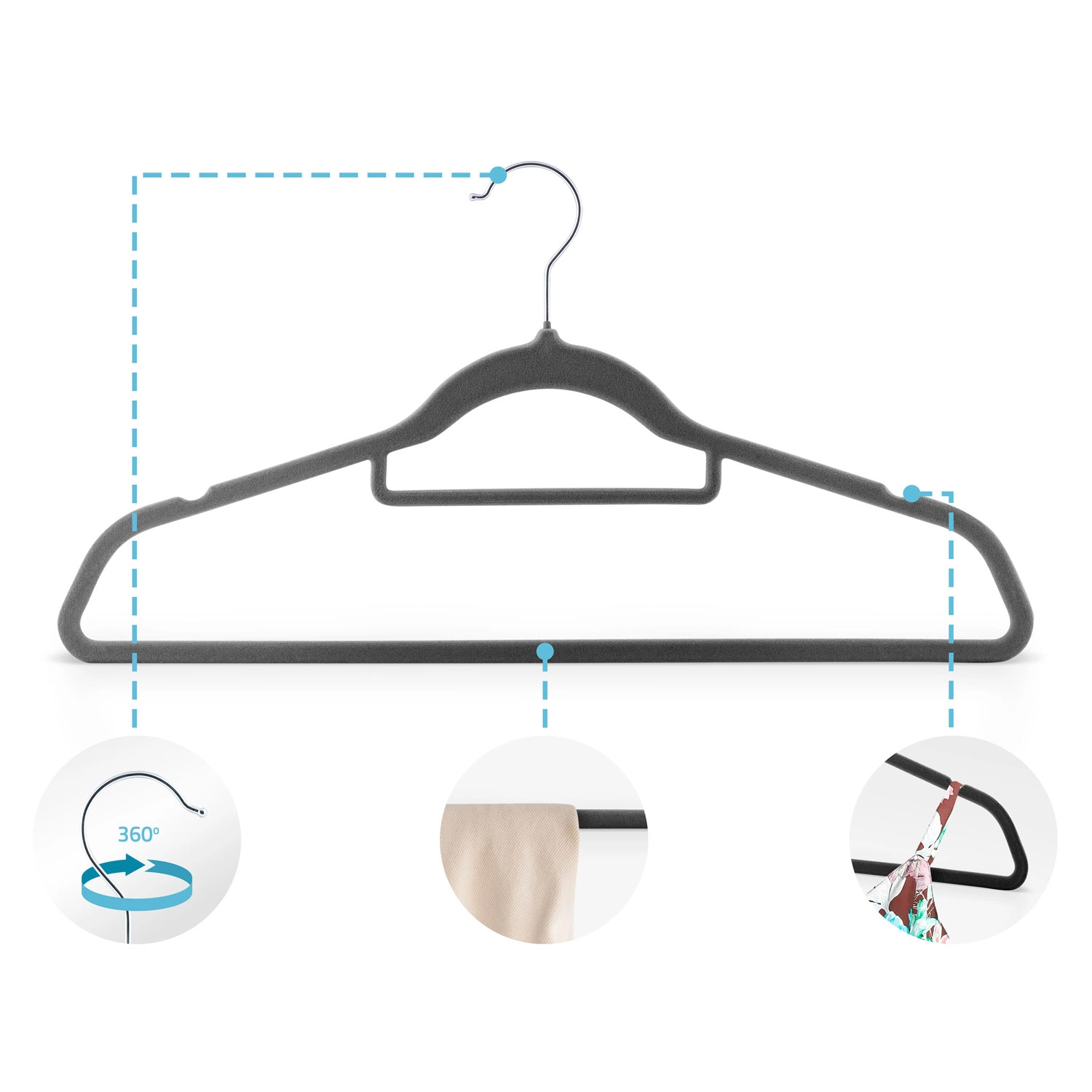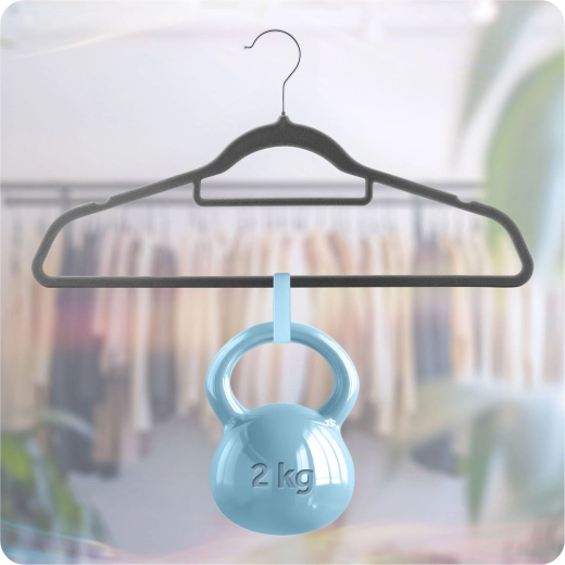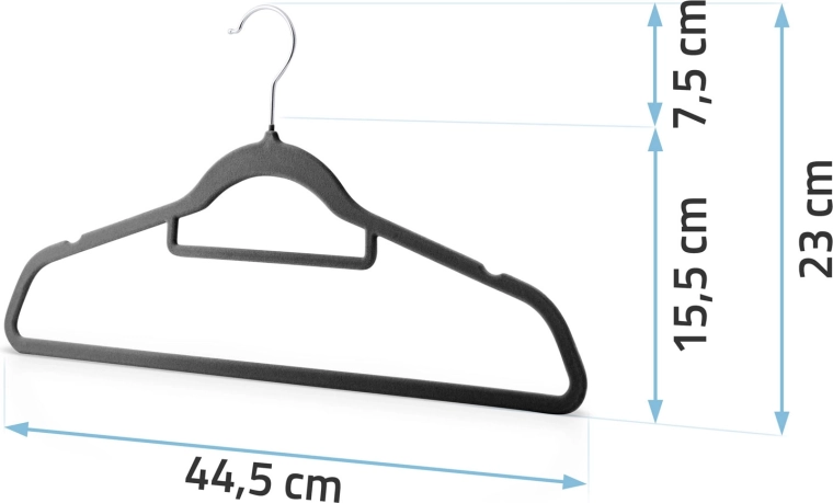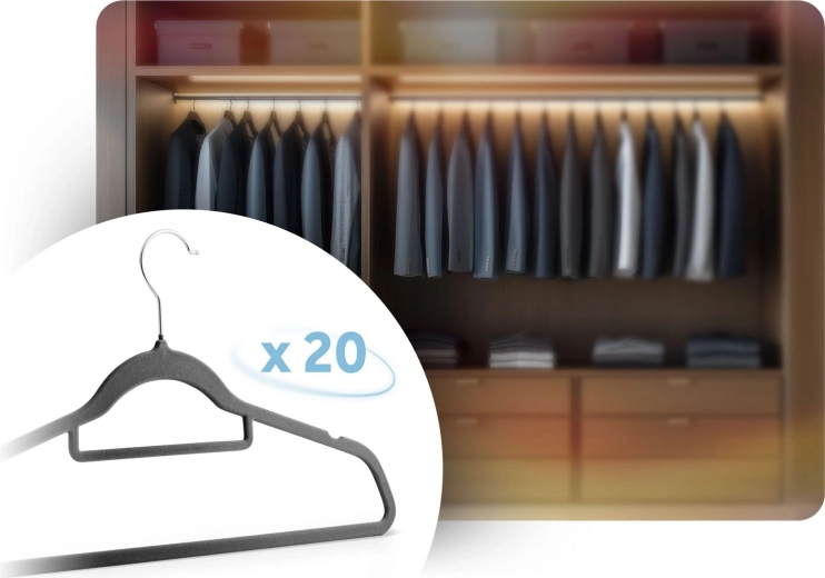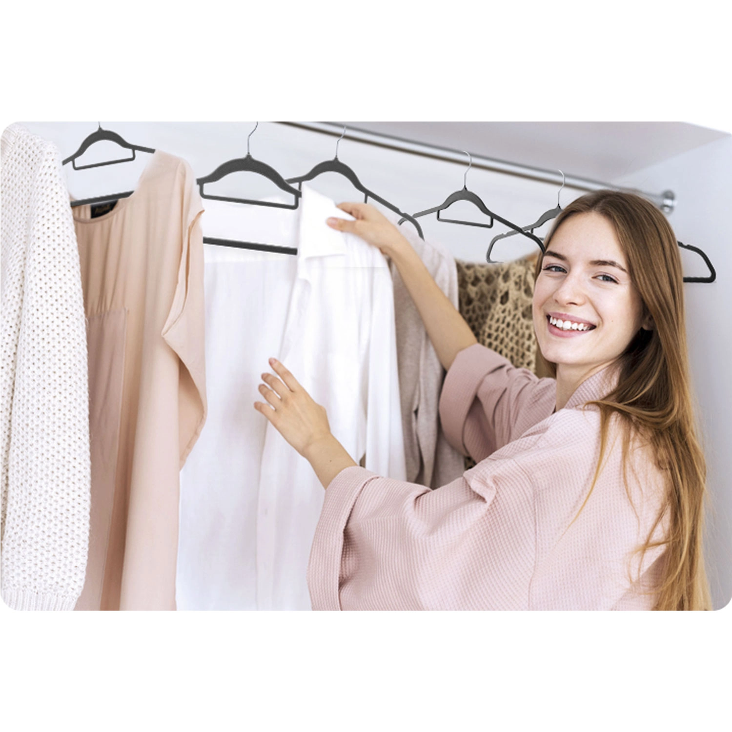 The velvet coating provides excellent grip, so dresses, blouses, and delicate materials do not slide down. A sturdy PP core with quality craftsmanship gives the hangers high load capacity, while the rotating metal hook makes sorting and access in the wardrobe easier.