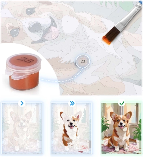 The Massido paint by numbers set with an adorable CORGI dog motif is a great choice for relaxation, creative activities, and quality time with family. Its foundation is a high-quality canvas on a wooden stretcher frame with pre-printed areas and numbers that match the paints in the box exactly. Thanks to the intense, highly opaque acrylics, you’ll achieve rich colors and a beautiful result without prior experience.