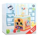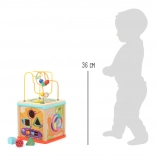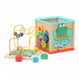 A fun and educational activity cube for little ones that develops fine motor skills, hand–eye coordination, and spatial awareness. It features a bead maze, shape sorter, gears, and other interactive elements with animals. Made from sturdy plywood and durable plastic for a long lifespan and safe play.