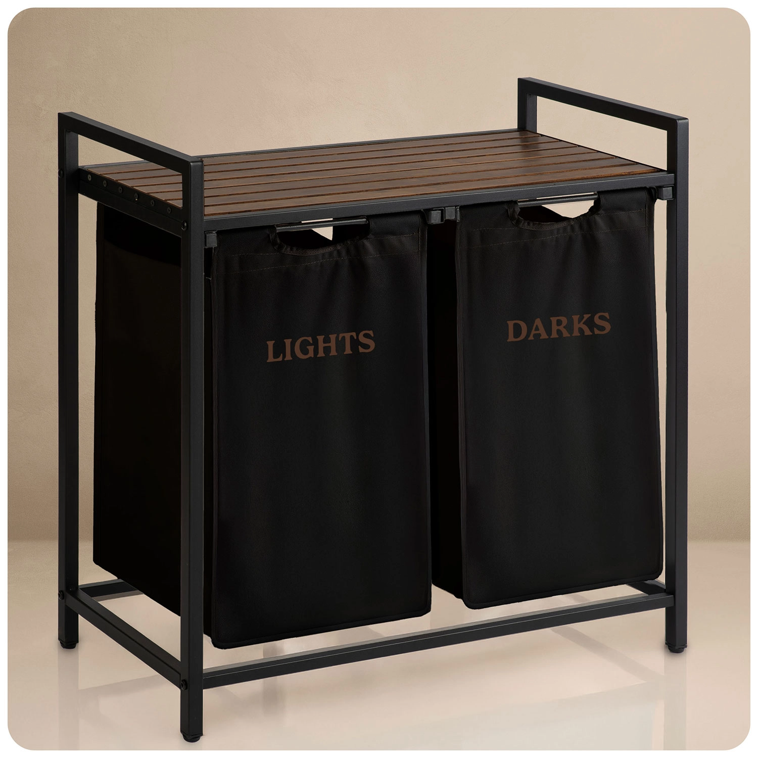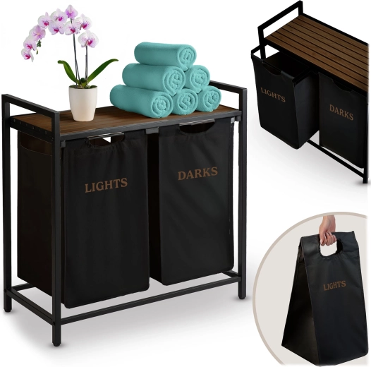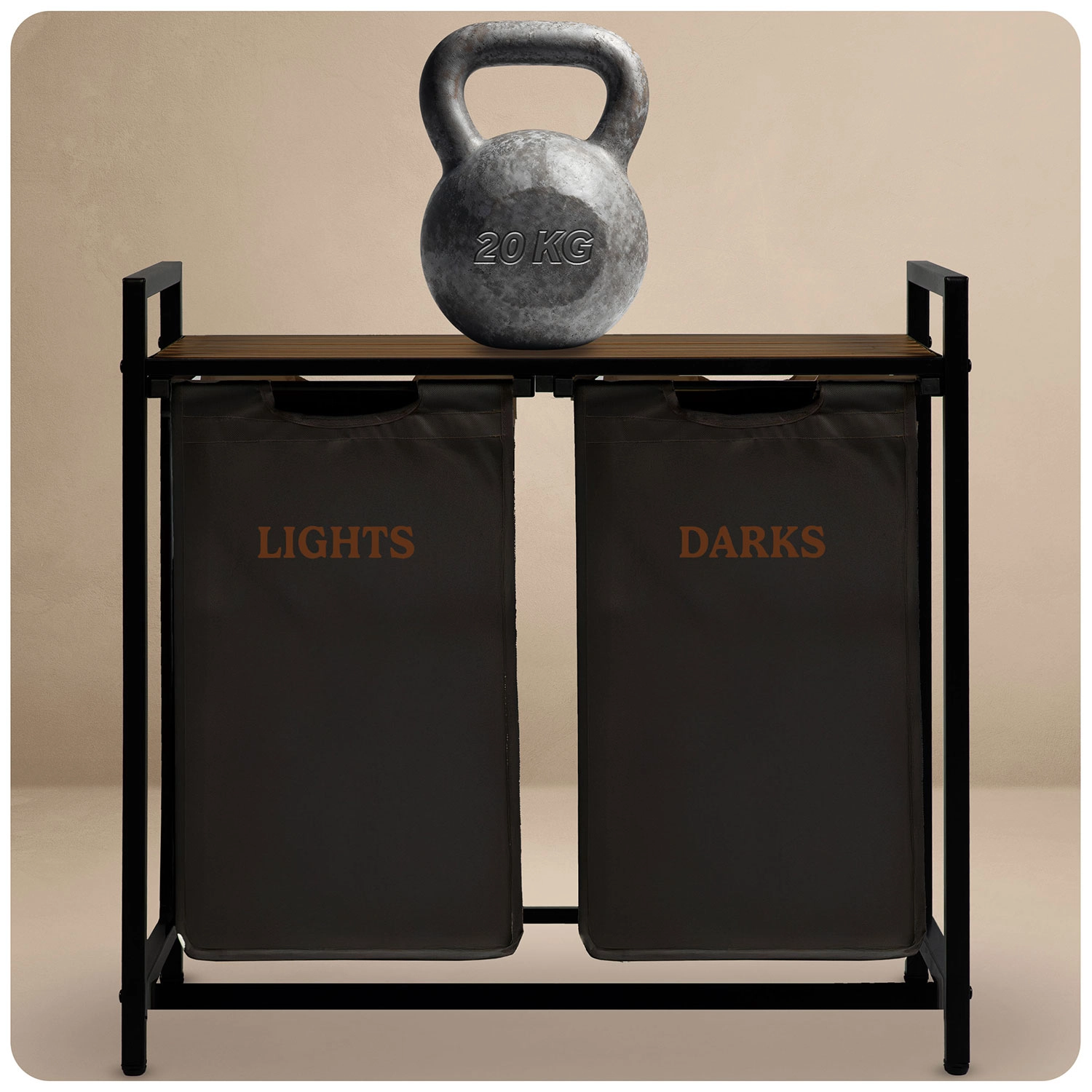 With two separate fabric bins labeled “Lights” and “Darks,” you sort laundry right when you drop it in—no more lengthy pre-wash sorting. The top natural wood shelf provides space for detergents, towel baskets, or small appliances and supports up to 20 kg.