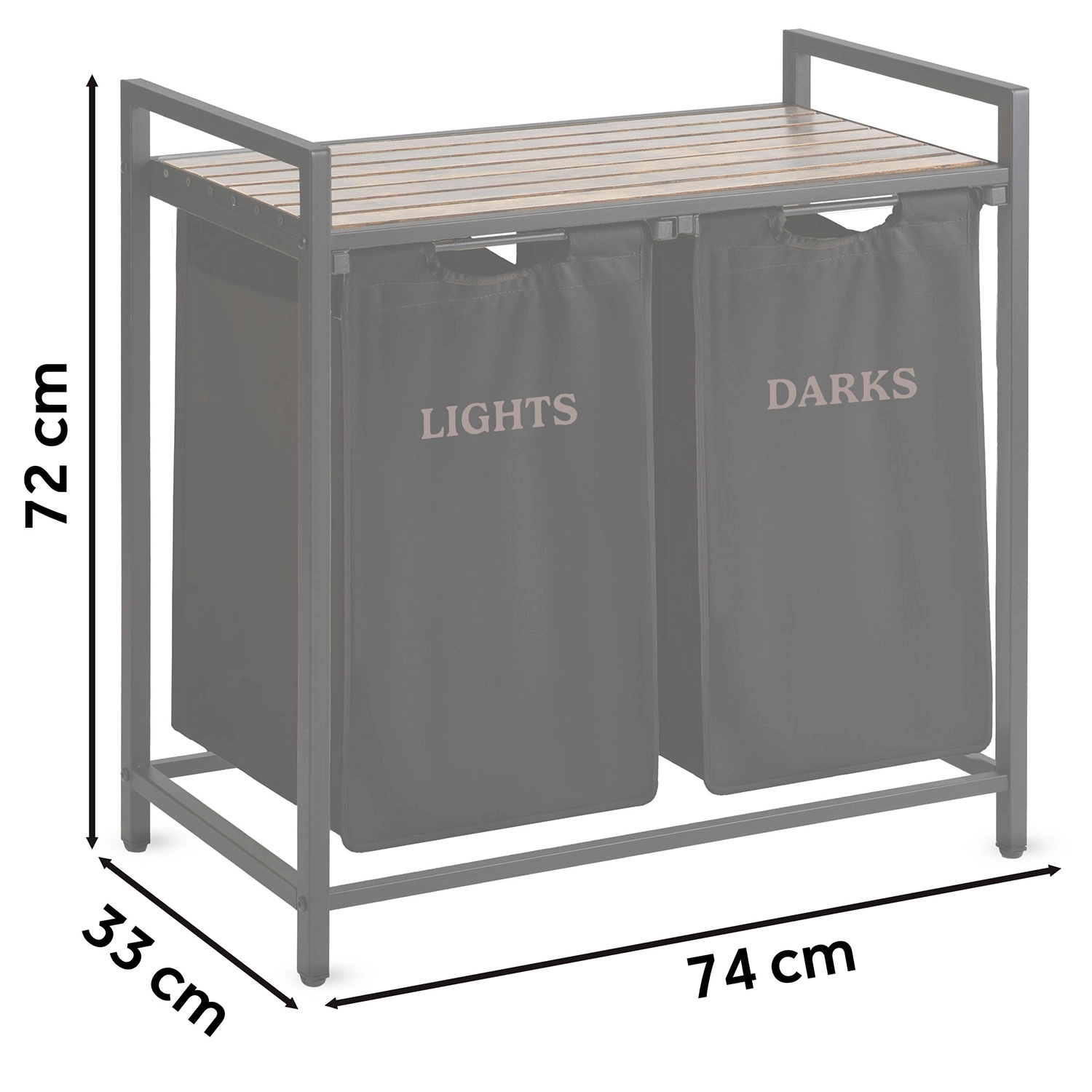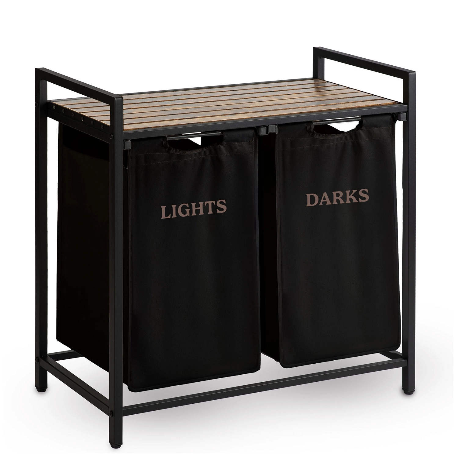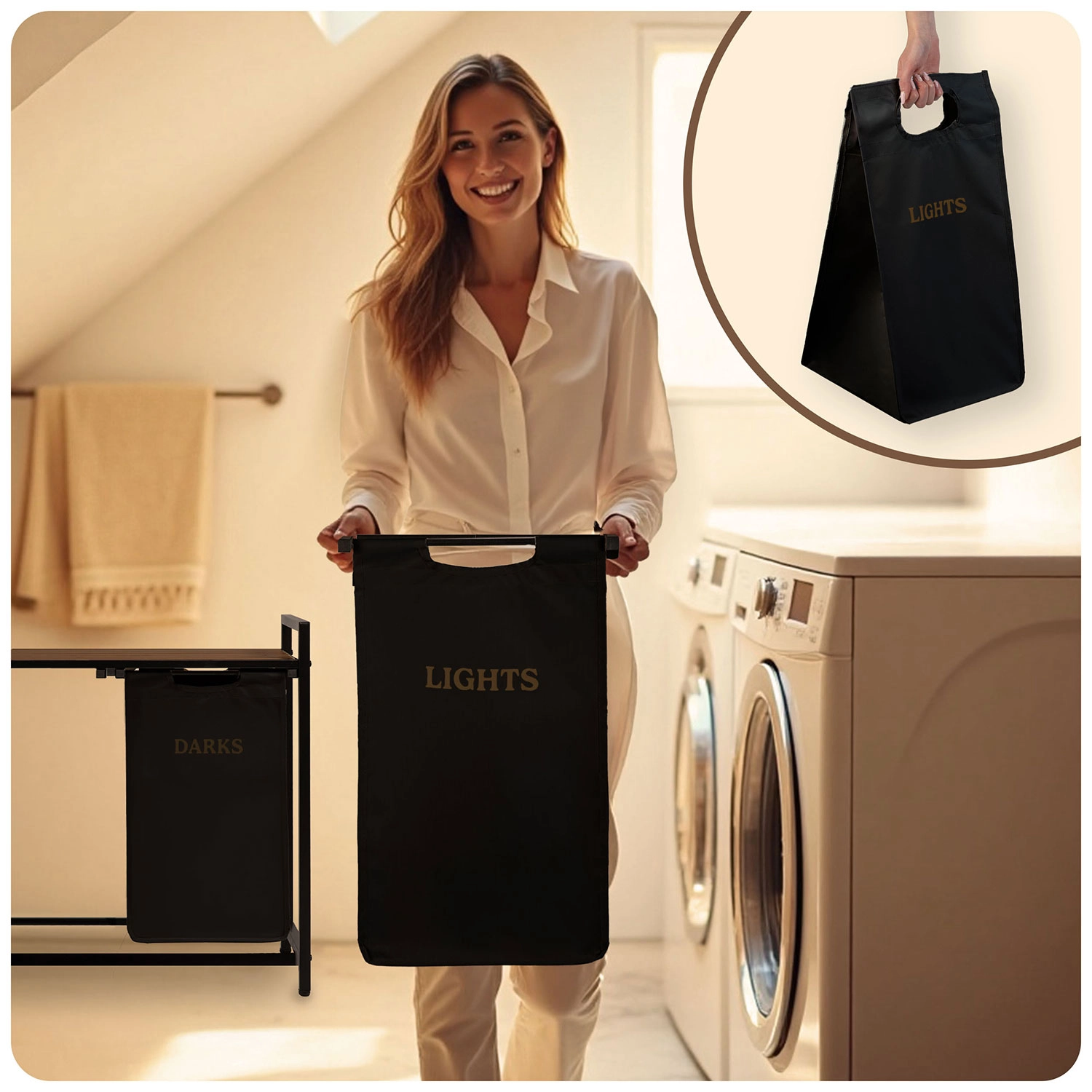 With two separate fabric bins labeled “Lights” and “Darks,” you sort laundry right when you drop it in—no more lengthy pre-wash sorting. The top natural wood shelf provides space for detergents, towel baskets, or small appliances and supports up to 20 kg.