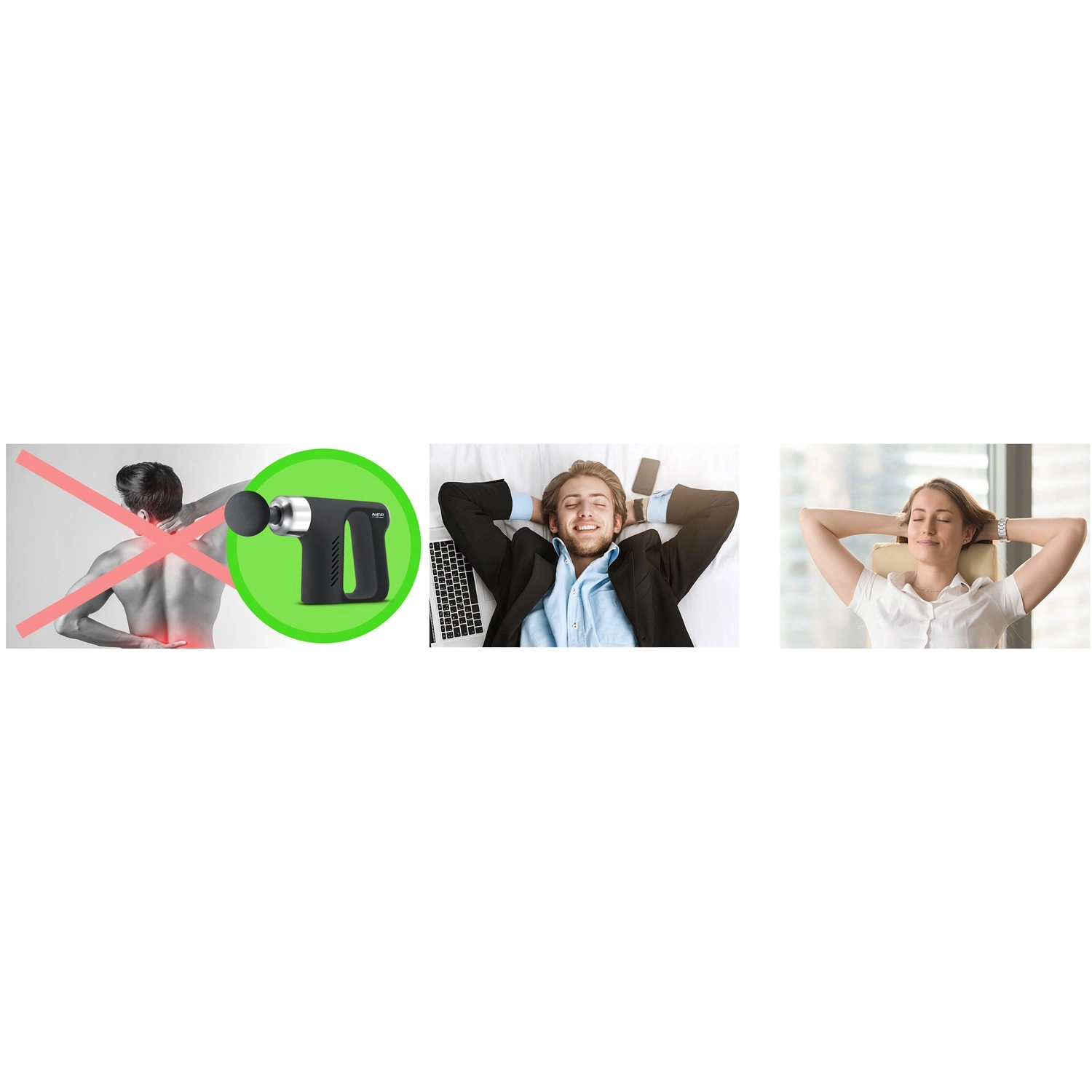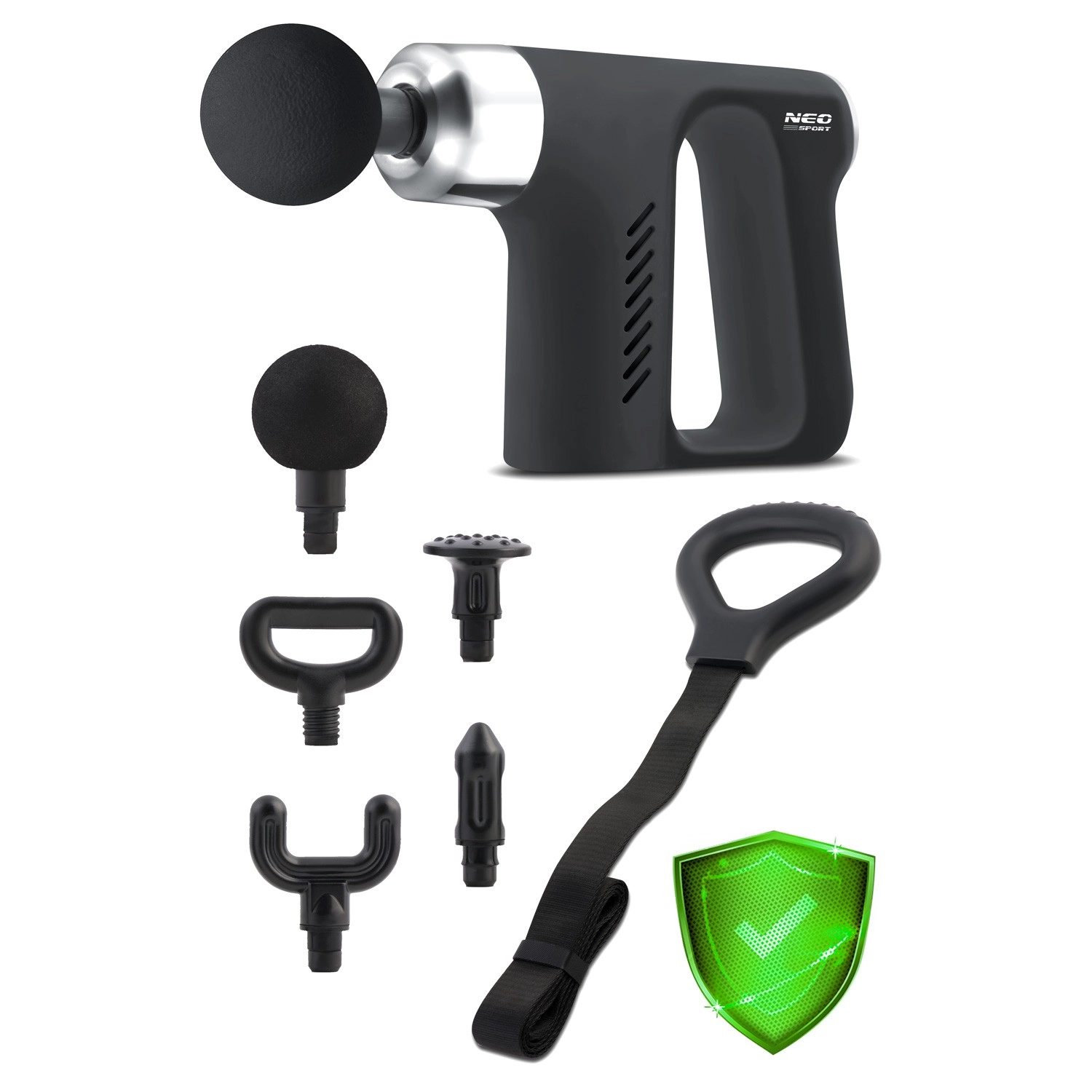 The powerful NEO Sport NS-502 massage gun delivers fast relief from muscle tension and supports recovery after training or a long day at the office. With 5 attachments and a practical massage belt, you can easily target different areas of the body. Its ergonomic design, quiet operation, up to 4 hours of battery life, and USB‑C charging make it an ideal companion for home and travel. Safety features include overload and overheat protection and automatic shutoff.