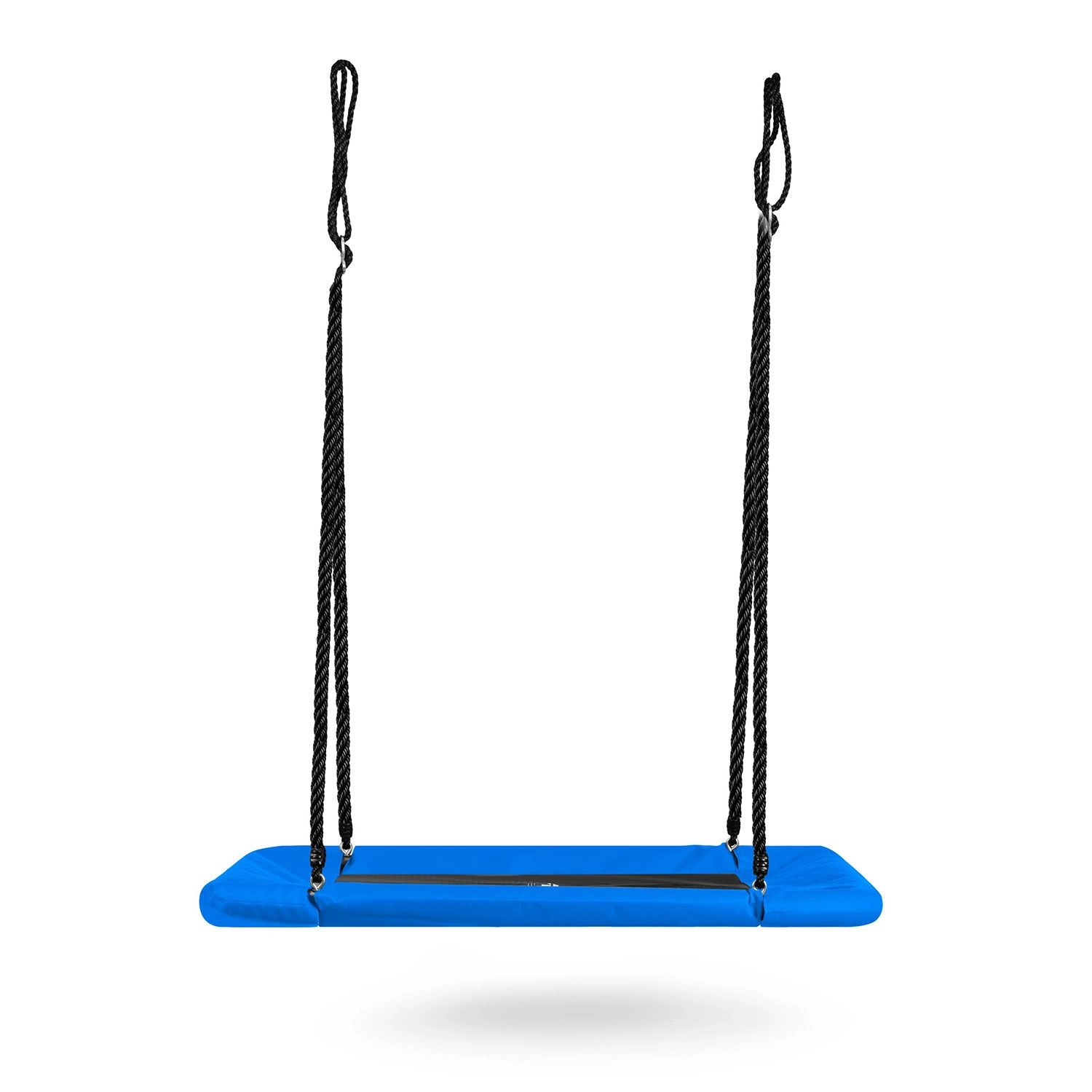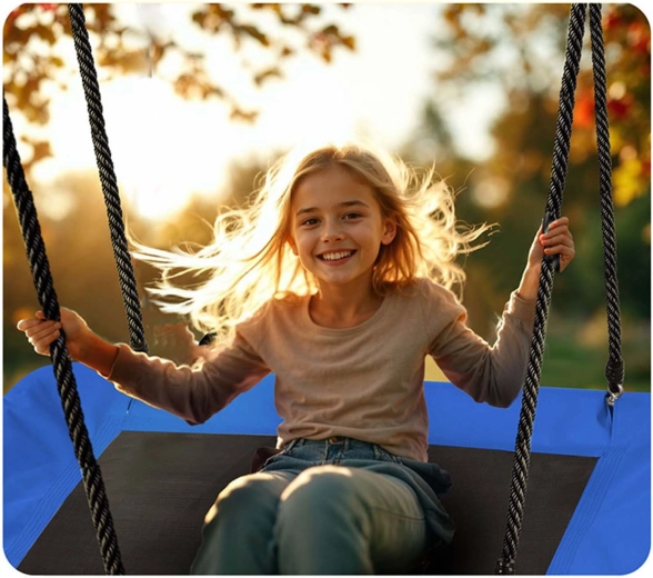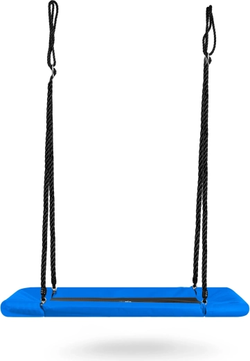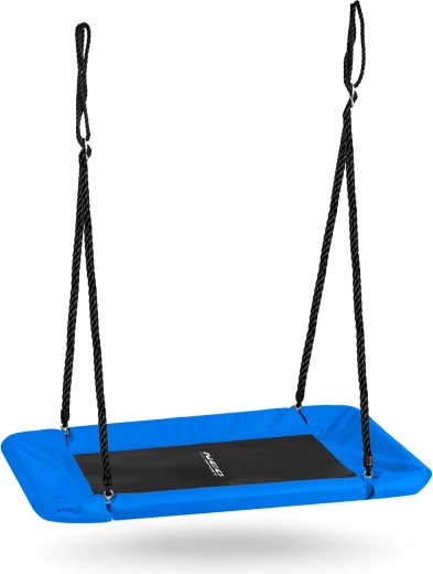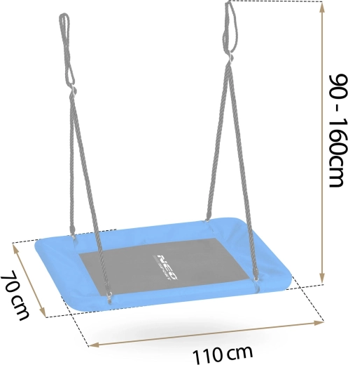 A large rectangular “nest” swing offers spacious and comfortable seating for both children and adults. Thanks to the water-resistant Oxford 600D seat, a sturdy steel frame with foam padding, and durable adjustable ropes, it’s ideal for safe outdoor fun. It’s easy to clean and can hold up to 150 kg.
