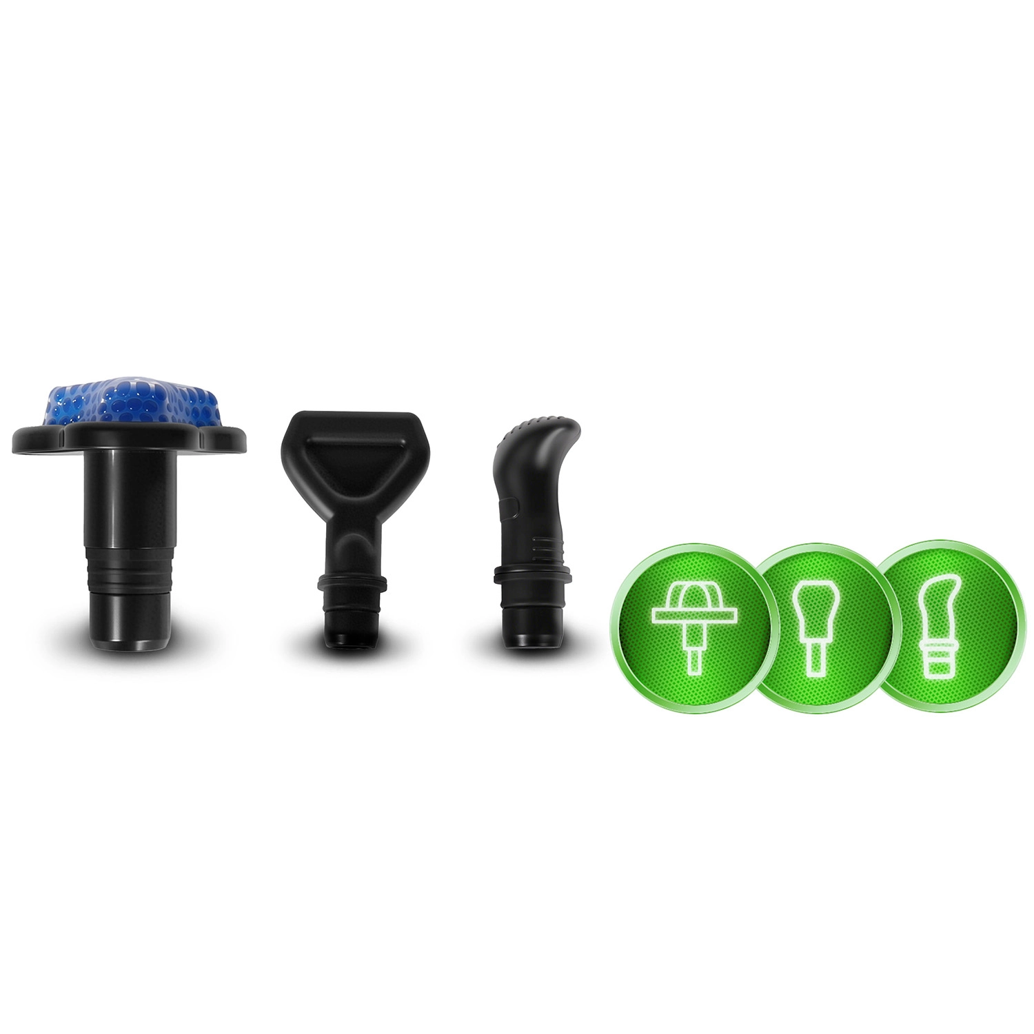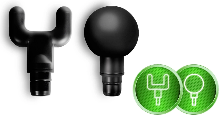 U-head for the area around the spine, ball for larger muscle groups, flat for all-round relaxation, bullet for intense trigger-point massage, cooling gel head, blade for along bony structures, finger head for precise pressure, double mushroom for stimulation and blood flow, and soft mushroom for sensitive areas.