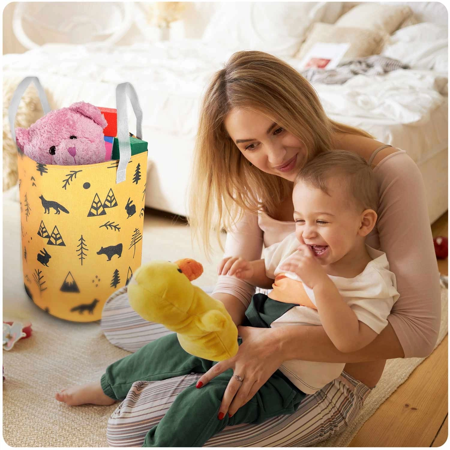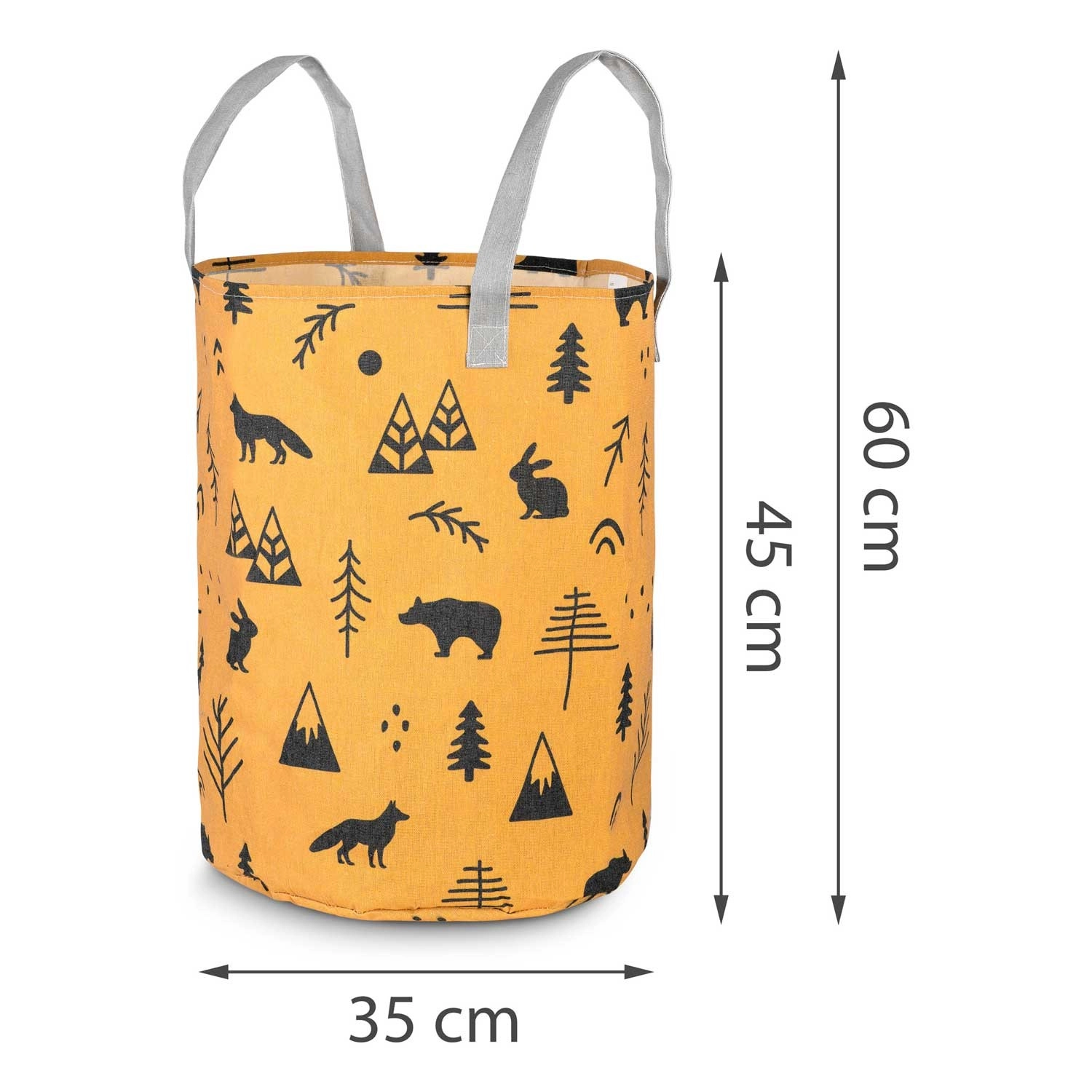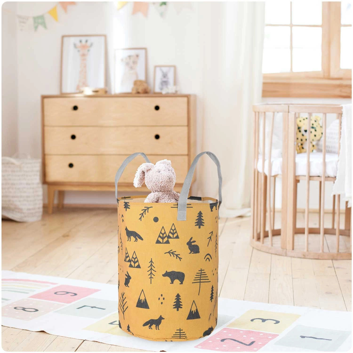 Make tidying up fun. The NUKIDO textile toy basket with a yellow forest-themed print is designed to be functional, durable, and aesthetically pleasing. Thanks to its tall cylindrical shape and open top, you can easily toss in plushies, blocks, and small items — and retrieve them in seconds.