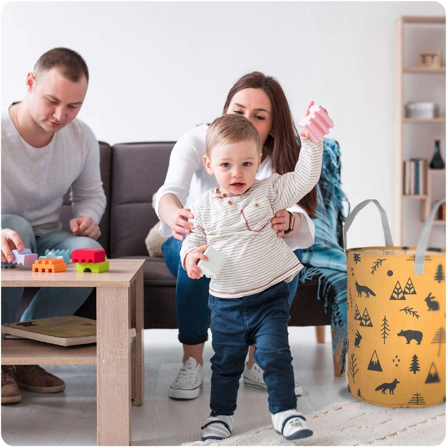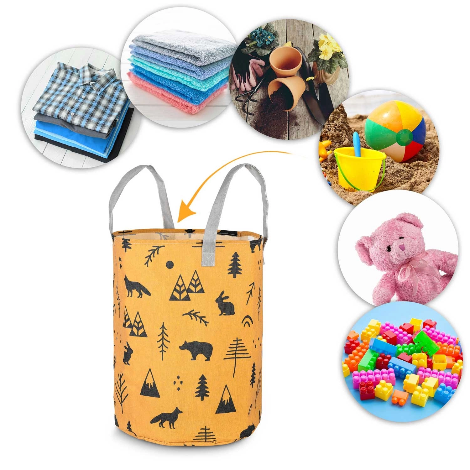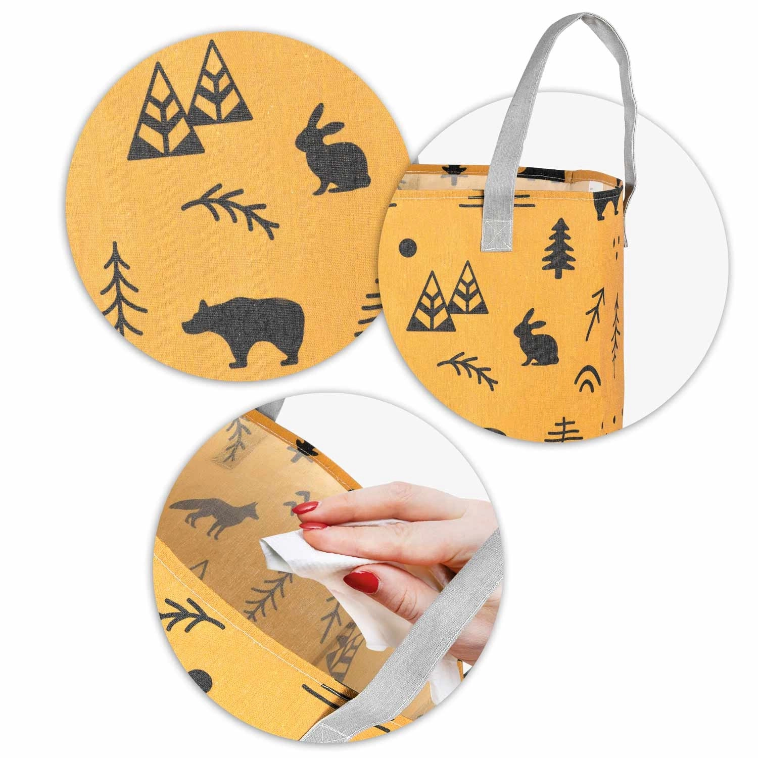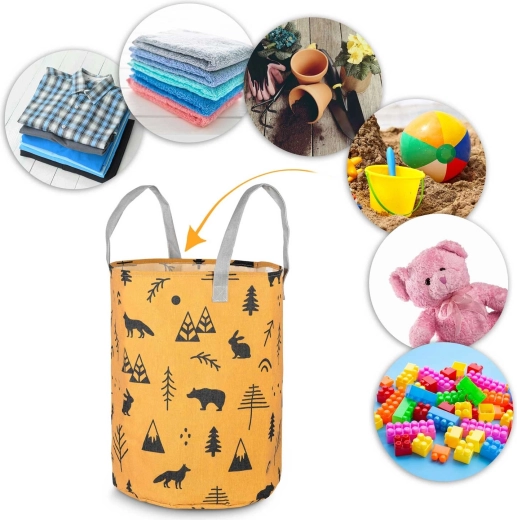 Make tidying up fun. The NUKIDO textile toy basket with a yellow forest-themed print is designed to be functional, durable, and aesthetically pleasing. Thanks to its tall cylindrical shape and open top, you can easily toss in plushies, blocks, and small items — and retrieve them in seconds.