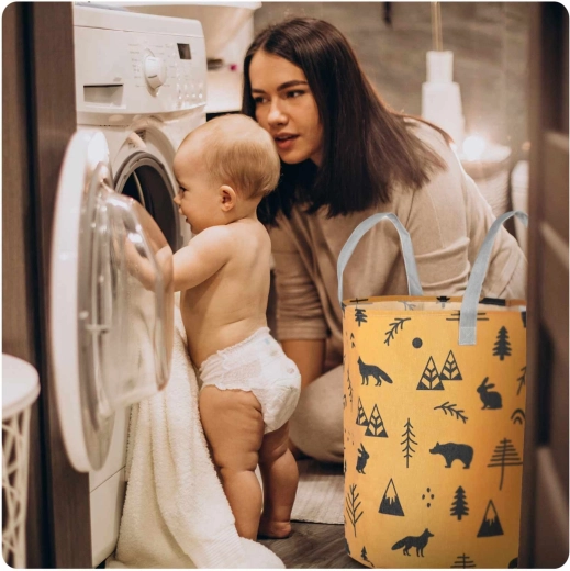 The basket is lightweight and portable with sturdy handles, yet it holds its shape and stands on its own. It fits perfectly in a kids’ room, bathroom, or living room — use it for toys, laundry, blankets, or accessories. The surface is easy to maintain, and the print adds a cozy, playful touch to the space.