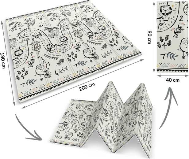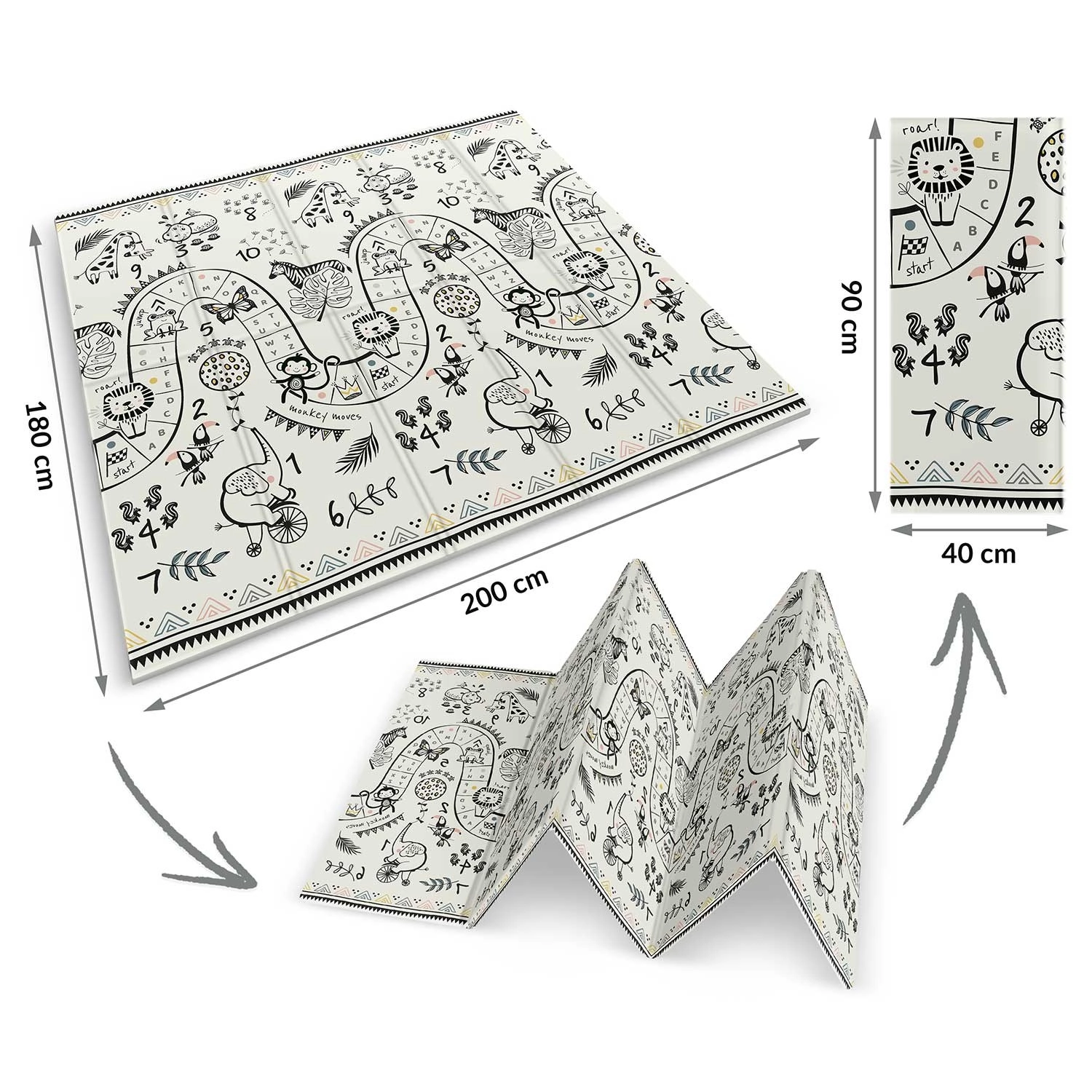 The NUKIDO foldable foam mat is designed down to the last detail: the sturdy 1 cm XPE foam effectively absorbs impacts, the lightly textured surface prevents slipping, and the double‑sided print (ocean and safari/path with numbers) supports early development, number learning, and sensory stimulation. Thanks to its waterproof, wipe‑clean surface, it can be cleaned in moments.