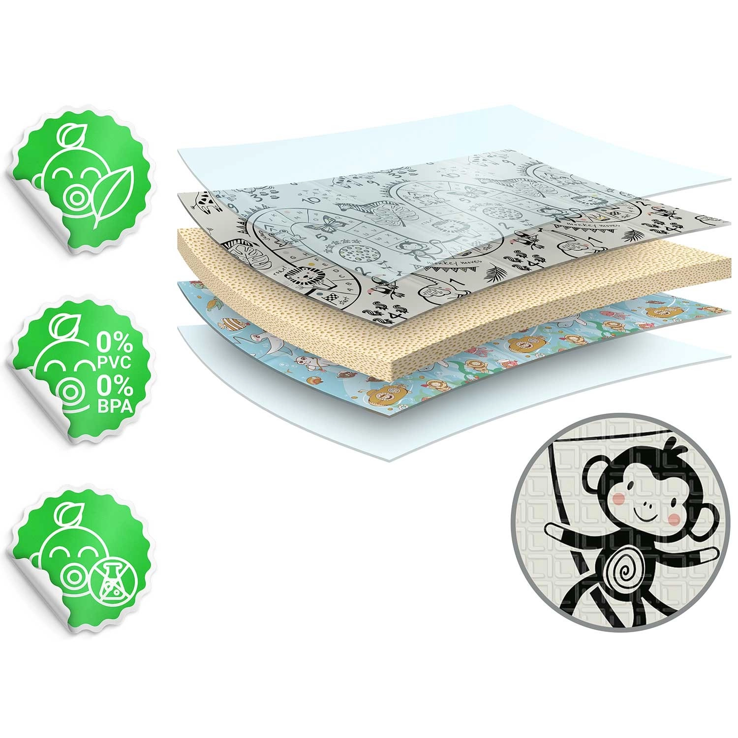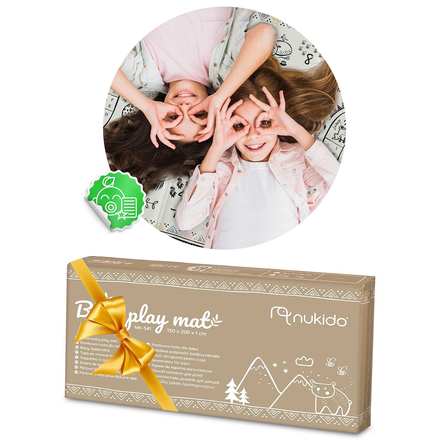 The large foldable NUKIDO mat measuring 200 × 180 × 1 cm offers soft fall cushioning, thermal insulation from cold floors, and a double‑sided ocean–safari design for fun and learning. It is waterproof, easy to clean, features a non‑slip surface, and is made of safe XPE foam free from BPA, PVC, phthalates, and formamide. Ideal for play, crawling, first steps, exercise, and picnics.