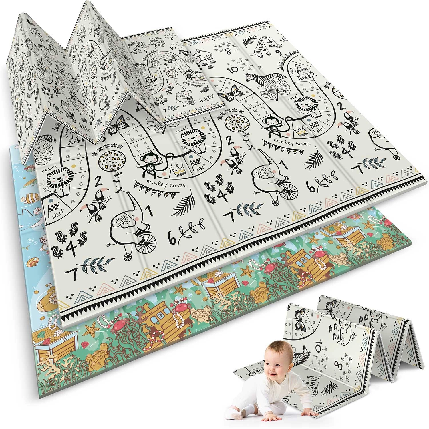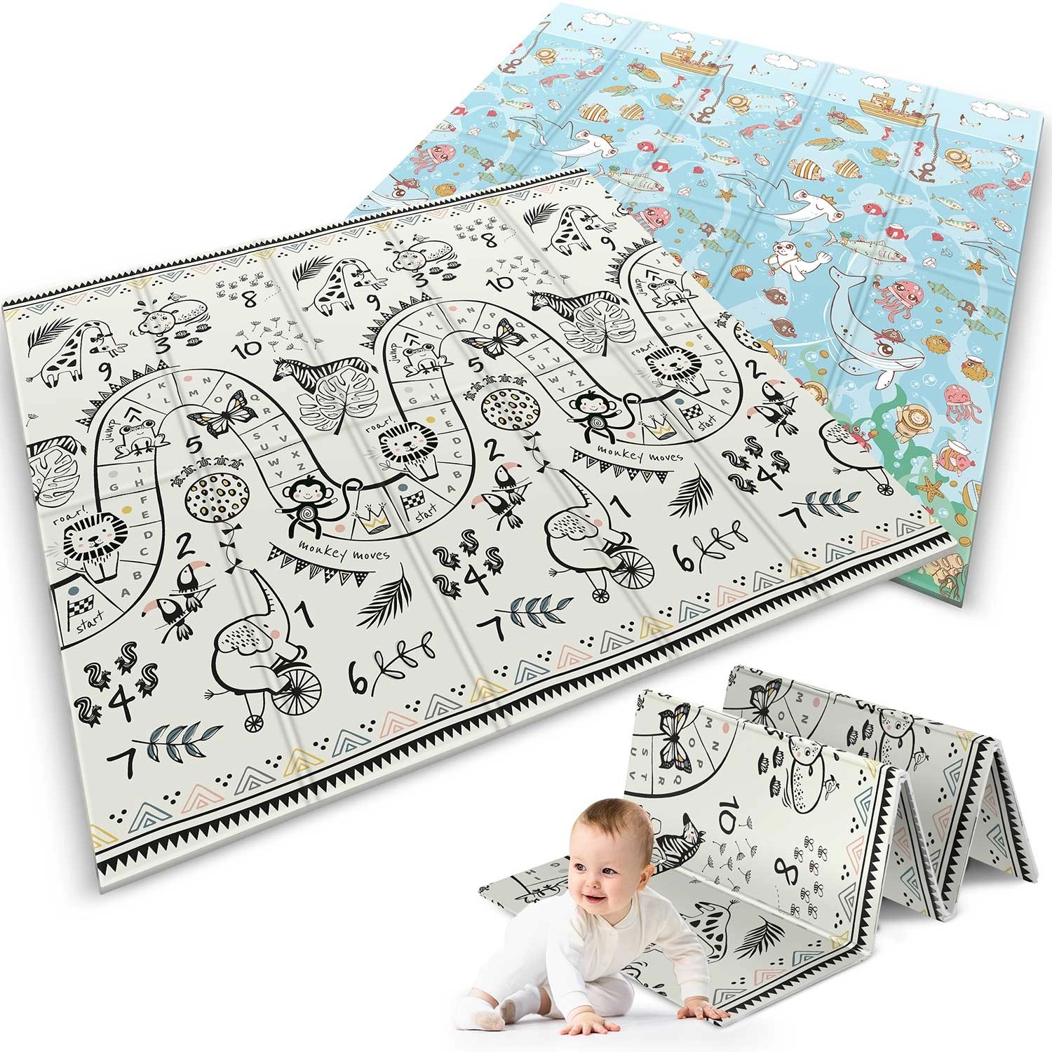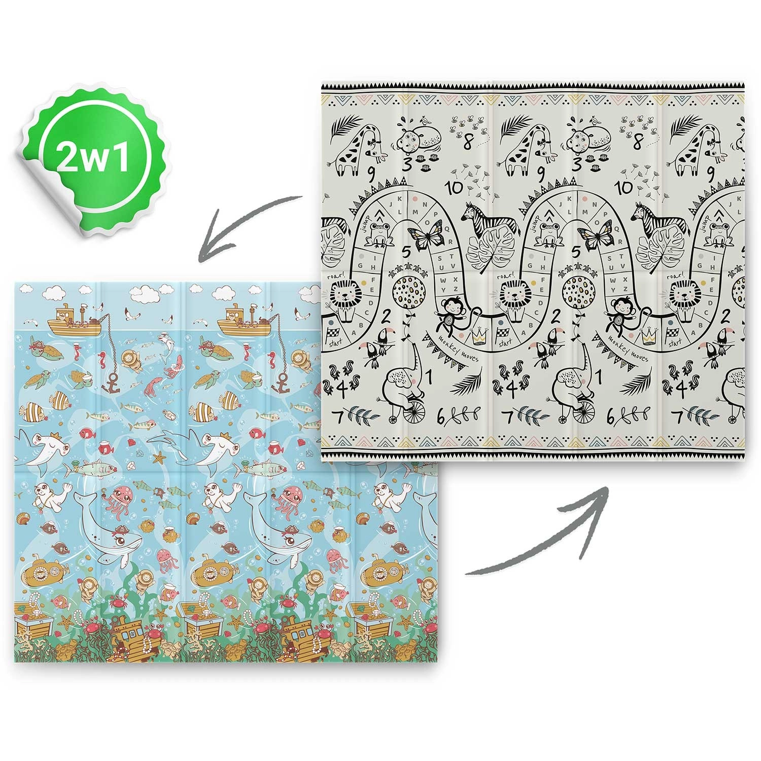 • 2‑in‑1 design: double‑sided print — colorful ocean and a black‑and‑white play track with animals and numbers.