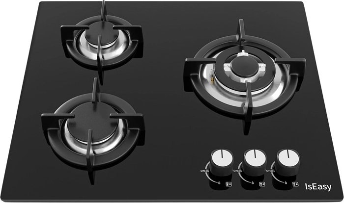 Black tempered glass is easy to keep clean and complements contemporary kitchens. Cast-iron grates keep cookware stable even during intense cooking, while mechanical knobs with integrated ignition provide quick, convenient flame start-up.