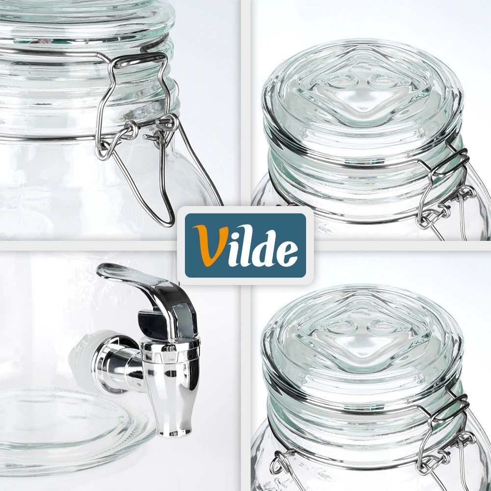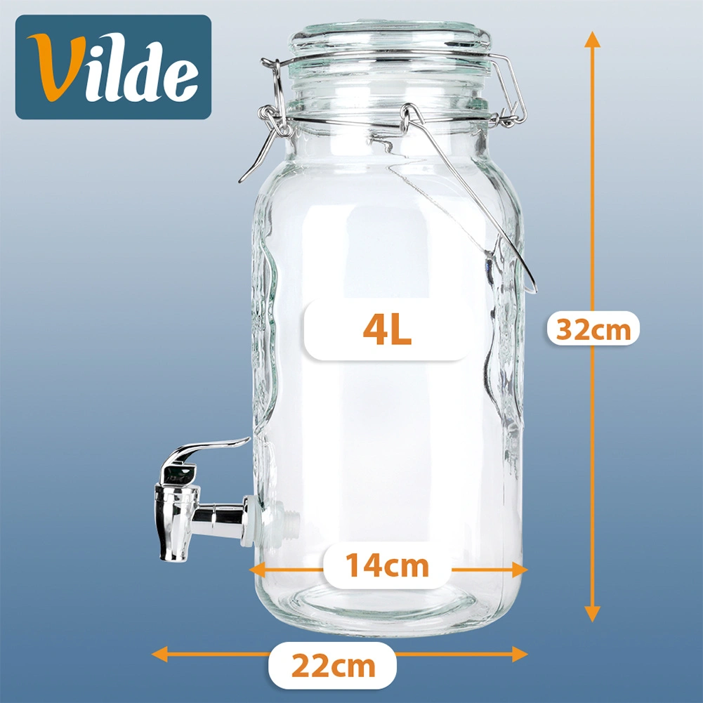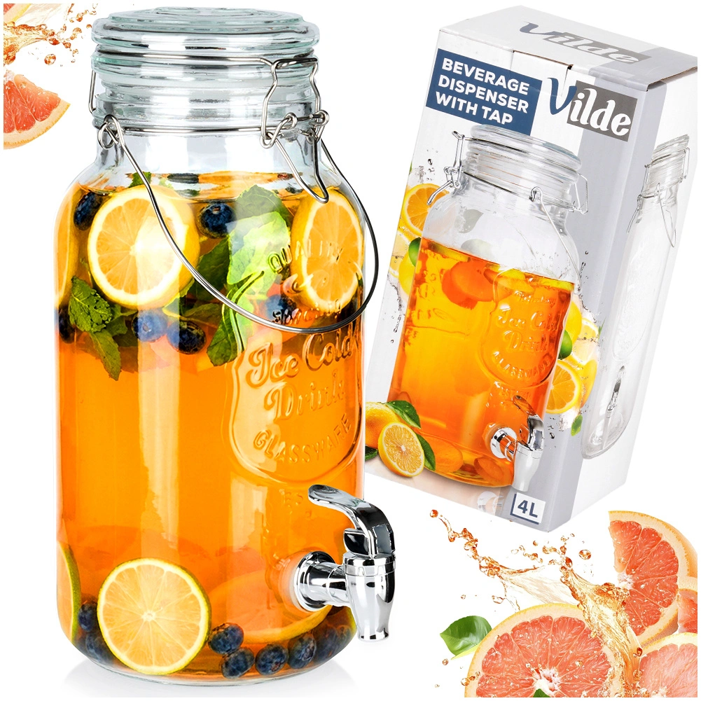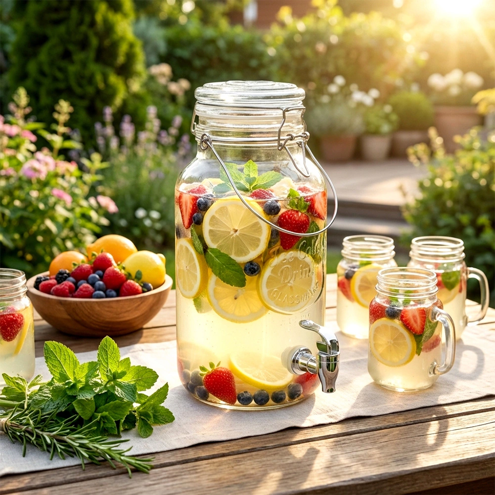 An elegant 4-liter glass beverage dispenser is a great choice for garden parties, family celebrations, and everyday home use. Made from clear, thick glass with a decorative relief, it beautifully showcases lemon slices, berries, and herbs. The spigot allows convenient dispensing without drips, and the airtight clip-top lid keeps your drink fresh and bug-free.