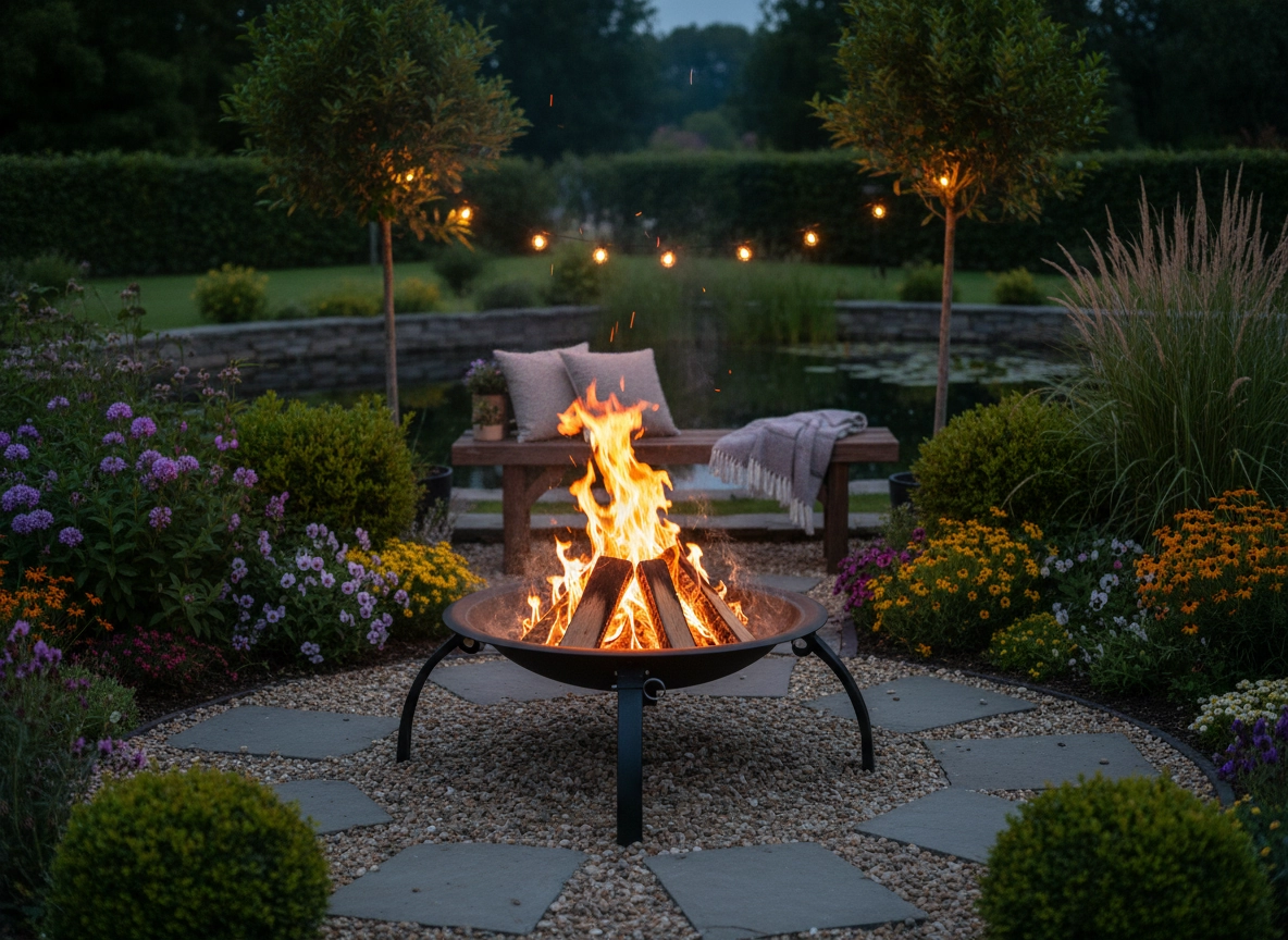 Included is a poker with a comfortable wooden handle for safely adding fuel and managing the fire. The open bowl design ensures good airflow, a stable flame, and even radiant heat—ideal for garden gatherings, grilling on a grate, or roasting sausages.