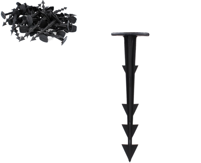 Suitable for use with agrotextiles, geotextiles, nonwoven fabrics, and films for mulching, plant protection, and weed suppression. The set of 50 pieces covers smaller and larger areas and makes installation quick and easy.